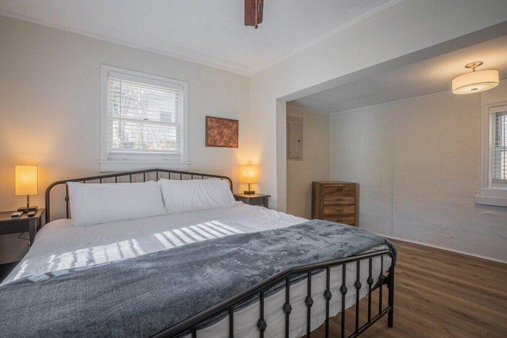 Feel at home in this peaceful and centrally located Athens cottage, perfect for a weekend getaway. This 1-bedroom, 1-bathroom home is historically charming with modern renovations. Walking through the front door, you'll immediately find yourself in the living room that hosts a comfy couch and a huge flat-screen Smart TV. Just a couple steps from the couch is the fully equipped kitchen that has stainless steel appliances and soft-close cabinets. Down the hall is the nicely renovated bathroom that has a wonderful walk-in shower great for taking a relaxing shower. Next to the bathroom is the spacious bedroom filled with tons of natural light and a comfortable king-size bed, Smart TV, and dresser. Outside, you will be able to enjoy the twinkling lights hanging over the fire pit while you warm up on a breezy night! Pets are welcome on the premises, and a pet fee of $125 applies. Please ensure to inform us in advance to secure authorization for bringing a pet. You are required to clean up after your pet, including waste or additional charges may apply. Minutes from UGA's campus, Sanford Stadium, and downtown Athens, you'll be close to some of Athens' favorite restaurants and hang out spots like Trapeze Pub, Last Resort Grill, Rook & Pawn, and much more! A car will most likely be needed. There is also a bus that stops nearby. Uber and Lyft are also accessible. Activities, dining, and drinks nearby include Barberitos, The Cafe on Lumpkin, J Christopher's, Marker 7 Coastal Grill, ZZ & Simmone's, Botanical Gardens, UGA Golf Course, and Sanford Stadium. Guests will receive a keypad code the day prior or the morning of their reservation date. [SI]