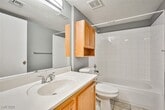 Beautiful 2 bedroom 2 bathroom, 2nd story Fully Furnished Condo with views of the community pool and hot tub from a private large covered porch with private gate. Laminate wood floors in common room and carpet in the bedroom. All appliances included with large breakfast bar. Both bedrooms have beautiful queen sized beds with high end mattresses and ceiling fans. Both bedrooms also have solar screen on the windows. The living room is spacious, with a high end Italian leather Natuzzi sofa, and a desk that’s great for working from home. Great location across the street from Spring Valley Metro Police Station in a gated community that allows for walking to shopping & parks. Everyone over 18 must apply online at Each applicant must have 620+ credit score, good rental history
