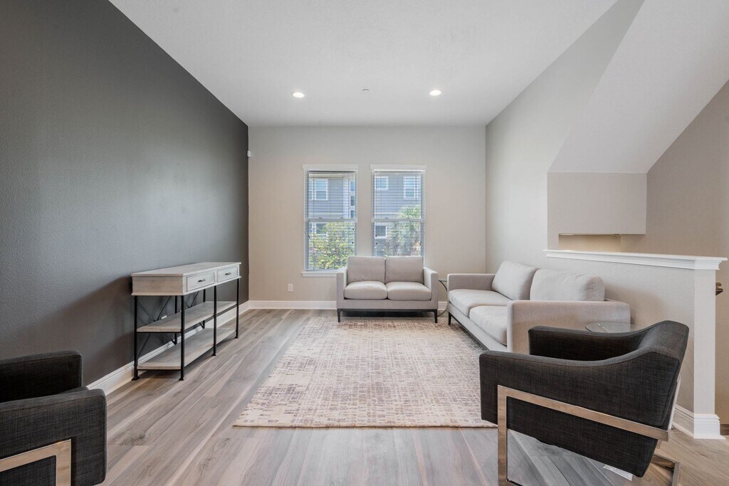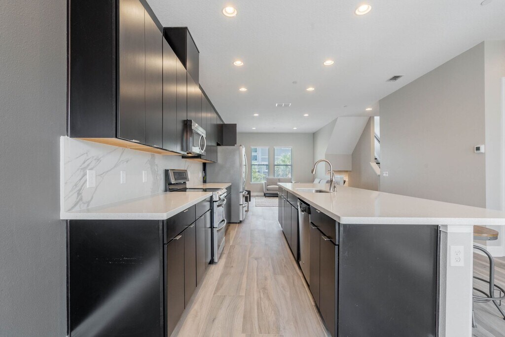 AVAILABLE NOW. Make this incredible, 3 level town home your next home. Steps from the Laureate park aquatic center, fitness, tennis, pickleball and Lake Nona Dockside! Walk up to your private townhome either through the main entrance or secondary entrance to the second master bedroom suite on the bottom level. Through the main entrance step up to the main living area with wood look tile flooring throughout and incredible kitchen. Kitchen featuring an eat-in area, stainless appliances, clear view refrigerator, double oven range and huge island. Spacious living area with staging furniture that can stay upon request as well as a private balcony. Upstairs features plush carpeting throughout and 3 bedrooms. Large master suite with dual shower heads, dual vanity plus walk in California closet. Front load washer and dryer also included along with internet service. This PET FRIENDLY property. Viewings available 7-days a week by scheduling online at the property managers website. All applications also taken online.
