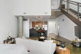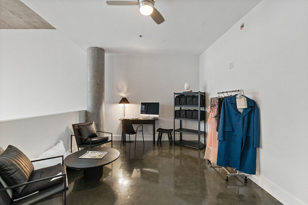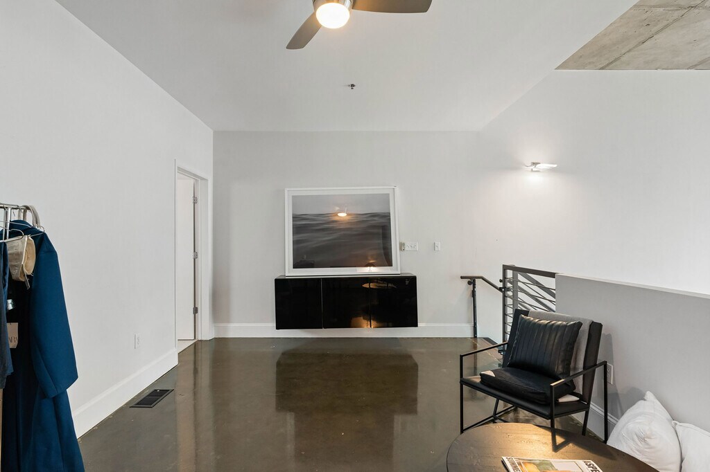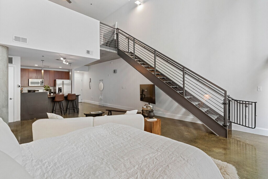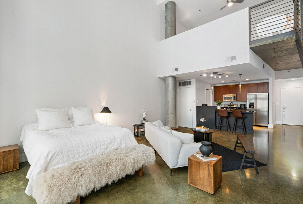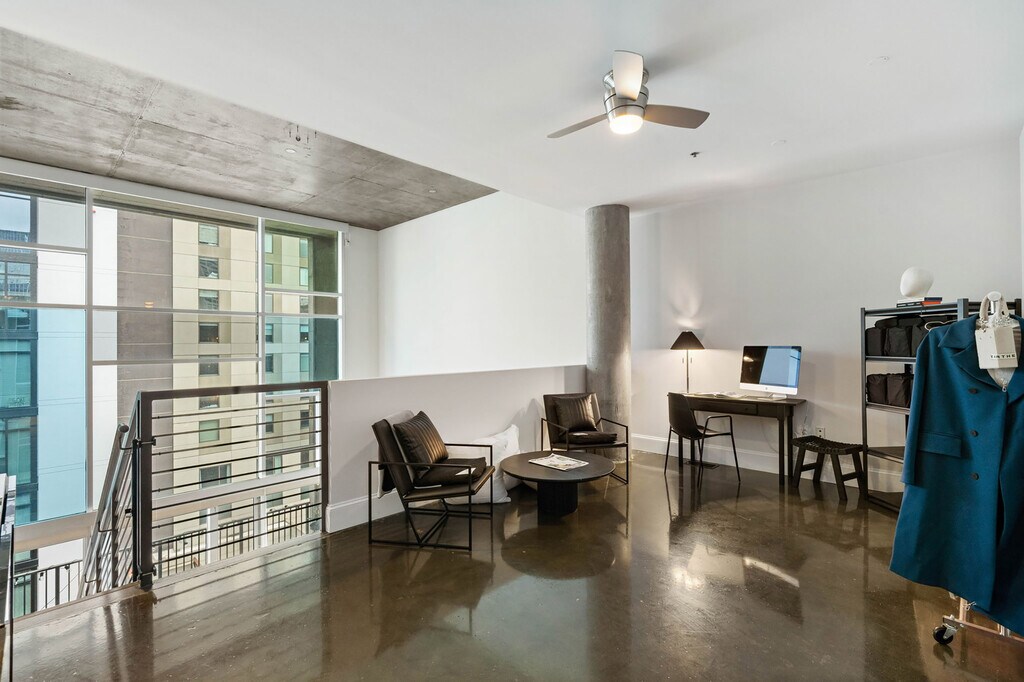 Live above it all in this striking top-floor loft with dramatic double-height ceilings and a stunning 25-foot wall of windows showcasing Midtown's iconic skyline. Spanning over 1,190 square feet, this open-concept residence offers exceptional flexibility ideal for those who value both sophisticated design and functional space for work, rest, and entertaining. The home's modern, minimalist aesthetic creates a calm, elevated retreat while keeping you moments from Midtown's energy. A gracious entry foyer provides gallery-style wall space for art and a sleek powder room perfect for hosting friends or colleagues. Polished concrete floors in a deep gray finish paired with crisp white walls deliver a refined, architectural look that adapts effortlessly to your personal style. The chef's kitchen overlooks the living area and is thoughtfully designed for both everyday living and entertaining, featuring stainless steel appliances, a matte black faucet, and upgraded open shelving in the pantry. A conveniently located stacked washer/dryer adds everyday ease. Upstairs, the loft level offers versatility as a private sleeping area, home office, or creative studio ideal for today's hybrid work lifestyle. The spa-inspired bathroom is finished in warm natural travertine and includes a walk-in steam shower, garden tub, double vanity, and a custom closet. Premium upgrades include a automated window covering system and new HVAC system. MidCity Lofts delivers one of Midtown's most sought-after condo experiences, highlighted by panoramic skyline views from the SkyClub, a rooftop pool, and a light-filled fitness center. HOA services include exterior maintenance, gas, trash service, 24-hour concierge, and secure garage parking for residents and guests. Rarely available, this one bedroom, one and one half bath unit includes two parking spaces. Ideally located in the heart of Midtown, enjoy walkable, bikeable access to Atlanta's top restaurants, entertainment venues, Georgia Tech, and the 10th Street MARTA station making this the perfect home base for professionals who want connectivity, style, and convenience without compromise.
