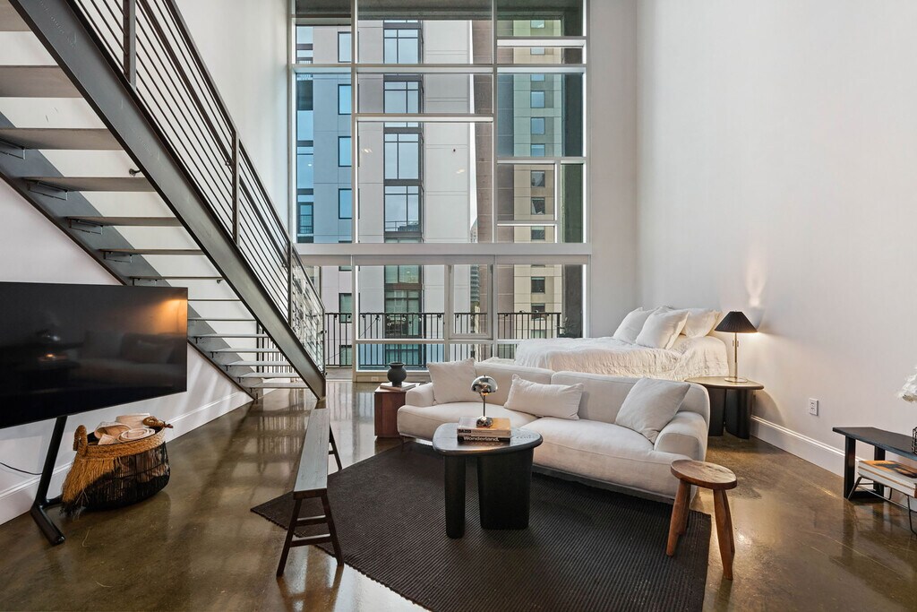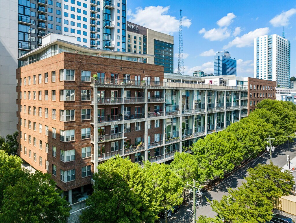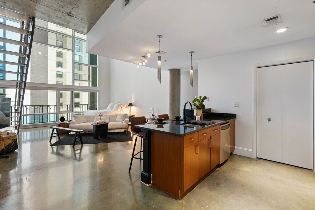 Live above it all in this striking top-floor loft with dramatic double-height ceilings and a stunning 25-foot wall of windows showcasing Midtown's iconic skyline. Spanning over 1,190 square feet,this open-concept residence offers exceptional flexibility ideal for those who value both sophisticated design and functional space for work,rest,and entertaining. The home's modern,minimalist aesthetic creates a calm,elevated retreat while keeping you moments from Midtown's energy. A gracious entry foyer provides gallery-style wall space for art and a sleek powder room perfect for hosting friends or colleagues. Polished concrete floors in a deep gray finish paired with crisp white walls deliver a refined,architectural look that adapts effortlessly to your personal style. The chef's kitchen overlooks the living area and is thoughtfully designed for both everyday living and entertaining,featuring stainless steel appliances,a matte black faucet,and upgraded open shelving in the pantry. A conveniently located stacked washer/dryer adds everyday ease. Upstairs,the loft level offers versatility as a private sleeping area,home office,or creative studio ideal for today's hybrid work lifestyle. The spa-inspired bathroom is finished in warm natural travertine and includes a walk-in steam shower,garden tub,double vanity,and a custom closet. Premium upgrades include a automated window covering system and new HVAC system. MidCity Lofts delivers one of Midtown's most sought-after condo experiences,highlighted by panoramic skyline views from the SkyClub,a rooftop pool,and a light-filled fitness center. HOA services include exterior maintenance,gas,trash service,24-hour concierge,and secure garage parking for residents and guests. Rarely available,this 1/1.5 unit includes two parking spaces. Ideally located in the heart of Midtown,enjoy walkable,bikeable access to Atlanta's top restaurants,entertainment venues,Georgia Tech,and the 10th Street MARTA station making this the perfect home base for professionals who want connectivity,style,and convenience without compromise.