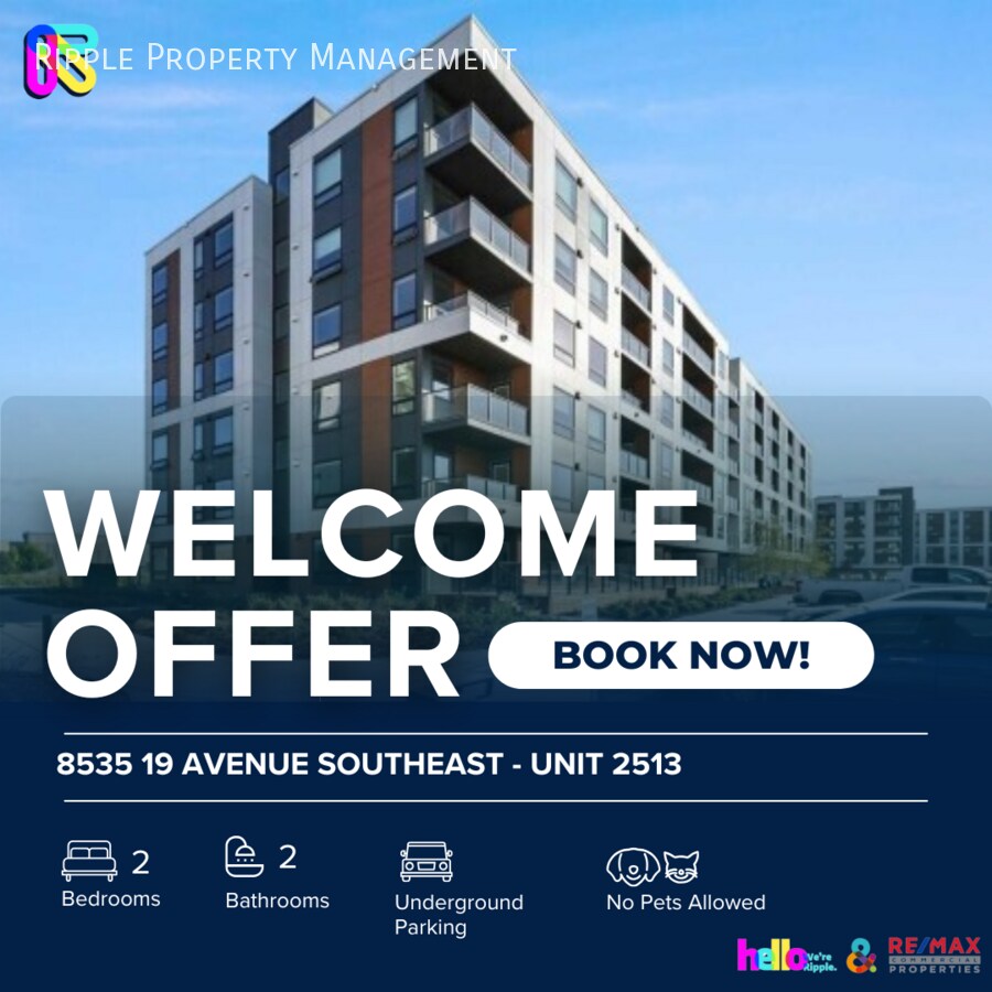APS94818713 - Modern 2 Beds, 2 Baths Apartment/Condo No Pets Allowed Monthly Rent for 12 Month Term Includes Welcome Offer Welcome to your new home at 8535 19 Avenue Southeast - Unit 2513 - Unit 2513 a modern and well-maintained 2 beds / 2 baths / Apartment/Condo offering comfort, space, and convenience. Ideally located close to shopping, schools, parks, and transit. _____________________________________________________________ SHOWINGS: Conducted in an open-house format book your appointment today! Prices, availability, and promotions are subject to change without notice. VIDEO TOUR: _____________________________________________________________ PROPERTY DETAILS: - Furnished or Unfurnished: Unfurnished - Pets: No Pets Allowed - Smoking: Non- Smoking - Parking: Underground - Storage Included: No - Laundry: In- Suite Laundry - Management Type: Placement Only - Lease Term: Long Term _____________________________________________________________ UNIT FEATURES: - Living Space:Open-concept living room layout, perfect for relaxing or entertaining - Kitchen: Sleek and modern kitchen with all appliances for a contemporary look with plenty cabinet storage to keep everything organized - Dining Space: Open-concept design flowing into the living space, perfect for entertaining - Bedrooms: 2 Bedrooms featuring ample storage for clothing and accessories - Window Coverings: Includes window coverings for privacy and light control ____________________________________________________________ UTILITIES: - Utilities Included: Heat,Water Here''s a helpful tool you can use to get a rough estimate of utility costs. Just check out the link: _____________________________________________________________ LOCATION HIGHLIGHTS: - Outdoor Living: Nearby Parks, Pathways, Greenspaces - Transit & Access: Transit Lines / Major Roads Nearby - Family Friendly: Close to Schools, Childcare, Rec Centres - Local Conveniences: Groceries, Shops, Restaurants, Services Nearby Don''t wait properties like this don''t last long. Book online today: Welcome Offer: The listed rent already includes a special savings equal to one month''s rent, spread evenly across your 12-month lease. Available on new 12-month leases only.