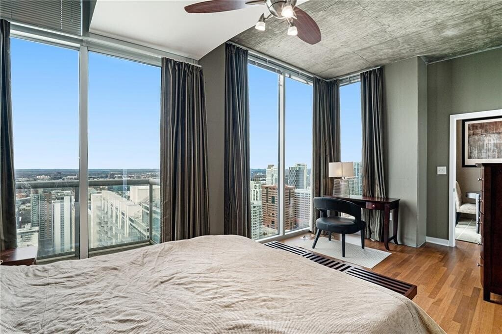 Stunning End Unit on the 32nd floor of Viewpoint,one of the most desirable condo buildings in Midtown. This corner unit has wrap around floor to ceiling windows in each of the bedrooms and living room providing tons of natural light and 270 degree unobstructed sweeping views to the Northwest and South. Step out on your balcony and look out to Buckhead,Kennesaw Mountain,Mercedes-Benz Stadium and Downtown Atlanta. Split bedrooms are large enough to both accommodate king beds or is ideal for home office set up. Two parking spaces in secured parking garage. Prime Midtown location to walk to restaurants,shops,Piedmont Park,the MARTA stations on 10th St and North Ave,The Fox Theatre,The High Museum,Woodruff Arts Center,Emory University Hospital Midtown,and the Beltline. Starbucks and the grocery store steps outside the building. Convenient to both GA Tech and GSU campuses! The monthly HOA includes Cat-5 Internet as well. Full building amenities have 24 hour concierge,on site management,package room,business center,oversized fitness center with weight & cardio sections,lounge and clubroom area that has a pool table and movie theater,and multiple outdoor terrace areas including grills,pergolas,gardens,outdoor fireplace and Olympic size pool. Unit can also be leased FURNISHED for an additional fee.