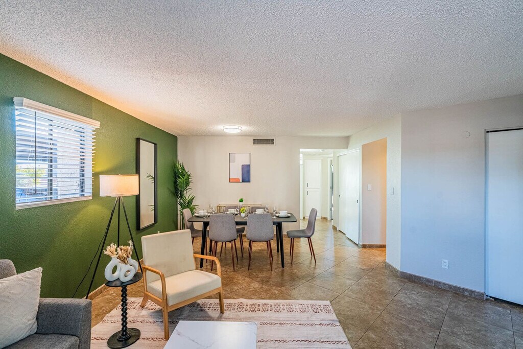 Experience serenity and feel at home in this modern 2-bedroom apartment in the heart of Scottsdale. Please note that there's one flight of stairs to walk up to the unit. The living space features an innovative open-concept design that blends the living and dining areas with the kitchen, creating a modern and sleek living experience. The fully equipped kitchen includes a microwave, stove, oven, refrigerator/freezer, dishwasher, toaster, coffee maker with coffee essentials, electric kettle, sink with hot and cold water, glasses, silverware, pots, pans, and a dining table with chairs. The apartment also features a sofa bed, chair, and a 4K 55" HDR smart TV in the living room. Each bathroom features a bath with a shower, wash basin, mirror, toilet, towels, hand towels, washcloths, and essential toiletries. Parking is available on the premises, and instructions will be given at check-in. Pets are allowed depending on size or if they are service animals. To avoid having your reservation canceled, please inform us in advance and be honest about bringing a pet. An additional cleaning fee is required per pet: $20 per night for 1-7 nights, $200 for 8-29 nights, and $300 for 30+ nights. Located in the southeastern part of Scottsdale, Arizona, this apartment offers convenient access to award-winning restaurants, eclectic shops, and historic landmarks. Nestled in a peaceful residential neighborhood, this apartment offers a serene retreat away from the hustle and bustle. Nature lovers will appreciate the proximity to El Dorado Park, where you can hike and picnic. Shopaholics and foodies will love the convenience of Scottsdale Waterfront, Scottsdale Fashion Square, and Tempe Marketplace, all within a short drive. With quick access to major highways, including Loop 101 and Loop 202, you can easily explore nearby attractions and reach downtown Phoenix. Enjoy cultural activities at the Scottsdale Museum of Contemporary Art and the Scottsdale Center for the Performing Arts. Explore the McDowell Sonoran Preserve, a vast desert preserve offering hiking and stunning desert vistas. You're perfectly situated between lively Tempe and downtown Scottsdale, ensuring a wide array of entertainment options. Rental cars, ridesharing services like Uber and Lyft, biking, the Scottsdale Trolley, Valley Metro Bus, the Scottsdale Greenbelt, electric scooters, and taxi services are all readily available. Quiet hours are between 10 pm and 8 am every day. If there are noise complaints or any violation of this rule, it may result in cancellation of booking and removal from the property without a refund. There is a strict no-party policy. If there is a party of any kind, the police will be called and everyone will be removed from the property with no refunds. No unauthorized guests are allowed at the unit, and there is a $100 fine per guest if discovered. Smoking is prohibited without exception on this property. If any signs of smoking are found in the unit or on the premises, a fine of $500 will be imposed. If you are found to have brought pets without prior notification, there will be a $500 fee. There are noise monitors installed in our units that measure the noise levels in decibels. If tampered with, there will be a fee. Security cameras are in the hallways for security. You may be charged extra for cleaning if the property is left in a state that necessitates additional cleaning. Lost or unreturned keys will incur a fee of $80 for key replacements and $150 for key fob replacements. For delayed check-out, there will be a $500 late check-out fee. [SI]
