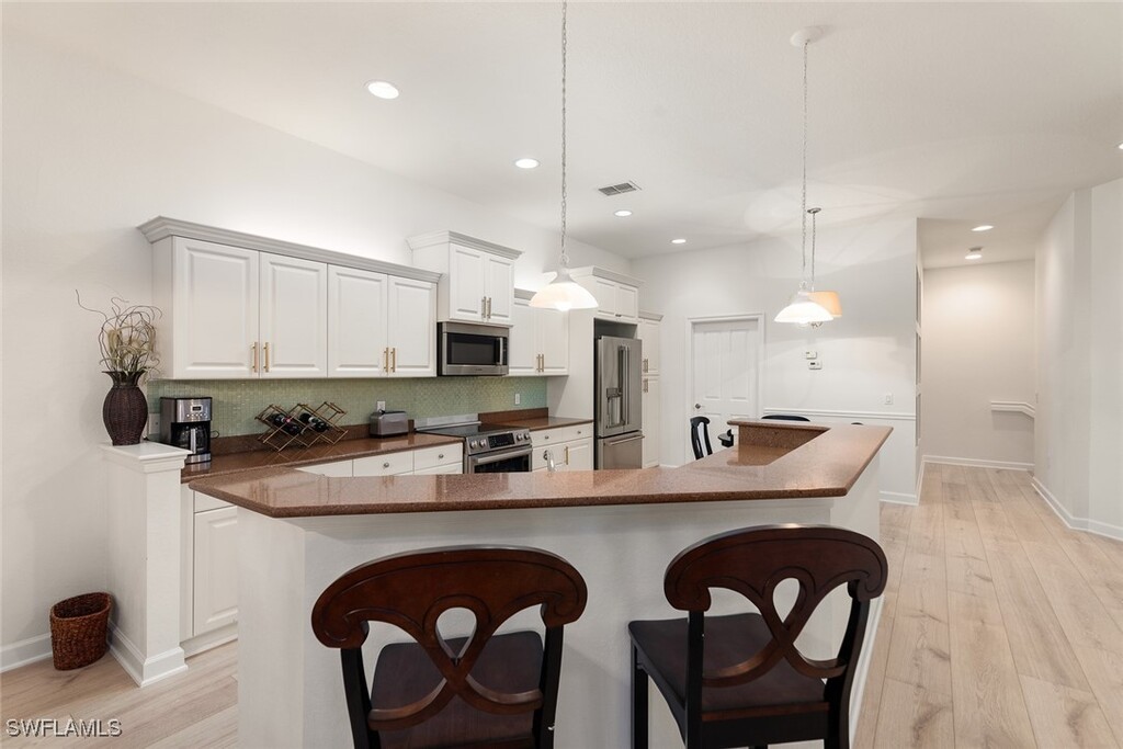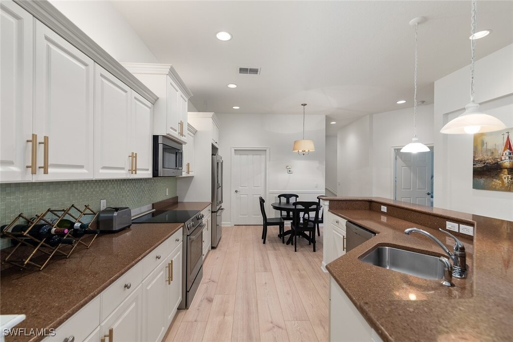3/2 END UNIT,Just bring your toothbrush,completely furnished,Extra large kitchen,plenty of cupboard space,Laundry room off the kitchen,formal dining room and great room leading out to Lanai which overlooks a lake and fountains and lit bridge. 10' ceilings throughout. Single car garage with a designated open parking space outside. You will love living in this resort community with amazing amenities,such as two lagoon style pools with rock grotto waterfalls,spa,jr olympic screened lap pool,clubhouse with full catering kitchen,library,5 har tru tennis courts with full time tennis pro,state of the art fitness center with full time fitness director,and your calendar will be filled with activities with our full time activity director. The best part is being able to walk to the Coconut Point Mall with over 25 restaurants,20 minutes to the beaches,18 minutes to the airport. You will love this vibrant Mediterranean style gated community