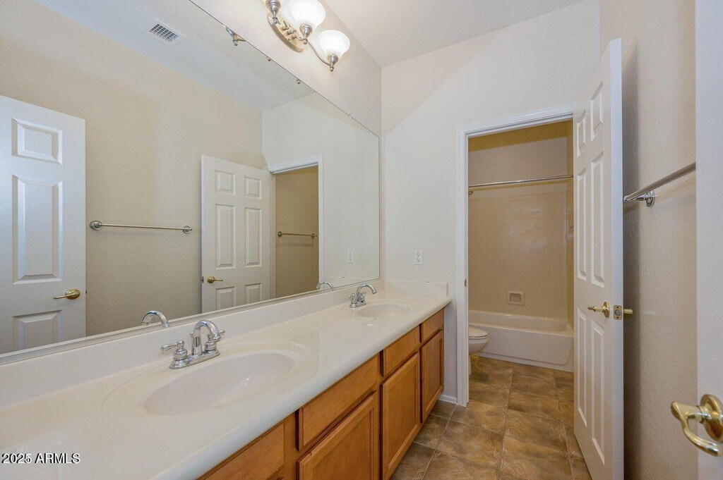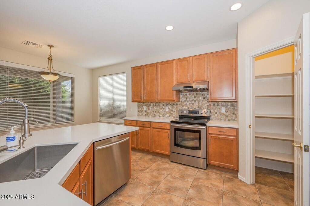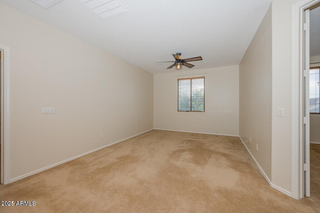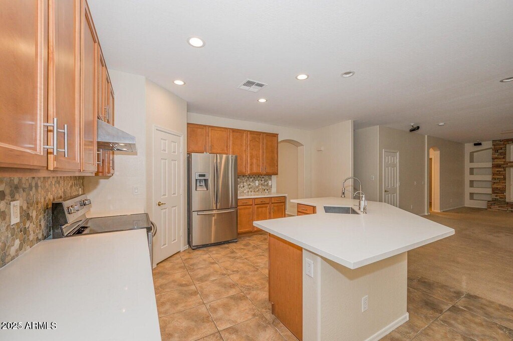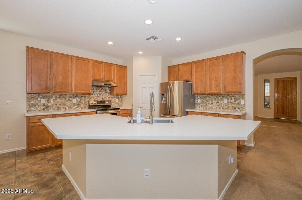 Beautifully spacious 4-bedroom,3-bath home with a 3-car garage in an unbeatable location! Featuring one bedroom and full bath downstairs plus a loft upstairs,this home is designed for both comfort and functionality. The open-concept floorplan is perfect for entertaining,highlighted by a large kitchen island,stylish backsplash,stainless steel appliances,and a double-door refrigerator with icemaker. Washer and dryer are also included. Fresh interior paint in a modern neutral palette makes this home move-in ready. Enjoy proximity to Raymond S. Kellis High School,Tanger Outlets,Desert Diamond Casino,State Farm Stadium,shopping,healthcare,and freeway access. No group homes.