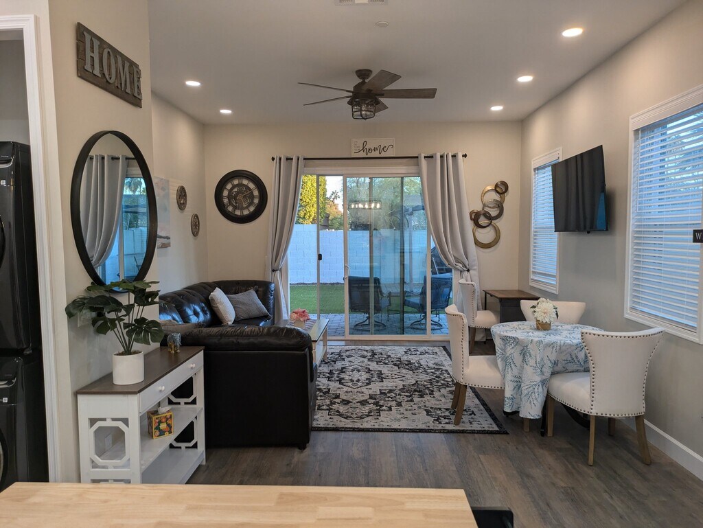 Available from 4/23/2026, month-to-month, $2000. $1500 month refundable security deposit. We are seeking a quiet and respectful mature tenant who will treat the property as their own. 1 person along with one home-trained dog (up to 20 lbs). A quiet couple may be considered. It's about 780sqf, has a 9.5' high ceiling, and has a separate entrance with a beautiful private backyard. It's recently built. Street parking. Beautiful backyard with grilling and sitting area. Located in a very safe and quiet neighborhood, Vista North Scottsdale (101 & Raintree). It's equipped with everything you need! The beautiful bedroom has a king bed, a big closet, and a smart TV. The bathroom has an elegant, big shower with a double sink vanity. Full washer & dryer. The kitchen has full-size stainless steel appliances. A background check for each adult applicant with good credit is required. Please note: It's a smoke-free place. No parties. A beautiful, attached, fully furnished one-bedroom one-bathroom apartment. Great North Scottsdale location! Convenient 5-10 mins to Mayo Clinic, Shea Hospital, parks, bike trails, West World, Kirkland, Fashion Square, and golf courses. Retail Target, AJ's, Safeway, Ross, Costco, Walmart, Trader Joe's, great restaurants Beautiful Thunderbird Park is located within a 5-minute walk and features a playground, as well as free access to football, tennis, basketball, and volleyball courts. A link to a Video of the house will be provided upon request.