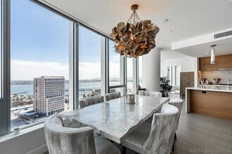 Experience refined urban living in this exceptional furnished rental at Pacific Gate. This 17th-floor home showcases dramatic curved walls of glass,framing sweeping city and bay views that come alive day and night. Meticulously crafted interiors feature luxurious custom built-ins,an expansive chef’s kitchen w/Miele,Sub-zero and Wolf appliances seamlessly connected to the living area and terrace. A unique formal entry creates the feel of a private single-family home,while the thoughtful split layout includes a private second bedroom ideal for guests or a home office. The primary suite offers serene bay views with iconic sightlines of the Coronado Bridge and a spa-like bath. Step outside to the private terrace perfect for enjoying vibrant city lights and coastal breezes. Offered fully furnished,this sophisticated residence blends comfort,style,and breathtaking views in one of Downtown San Diego’s most coveted addresses. Residents of Pacific Gate enjoy unmatched resort-style amenities,including a chef concierge,private yacht share,luxury car fleet,pool terrace with cabanas,outdoor kitchen and fire pit,residents’ lounge with catering kitchen,screening room,and fully equipped business and conference facilities. An exceptional opportunity to lease one of San Diego’s most desirable waterfront residences. MLS# 260003474