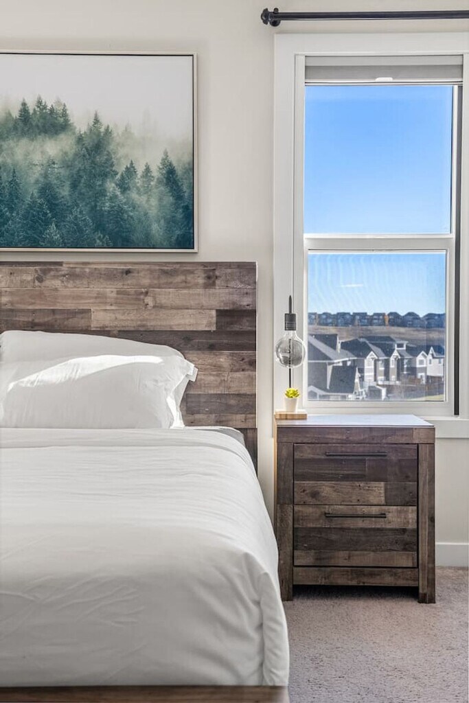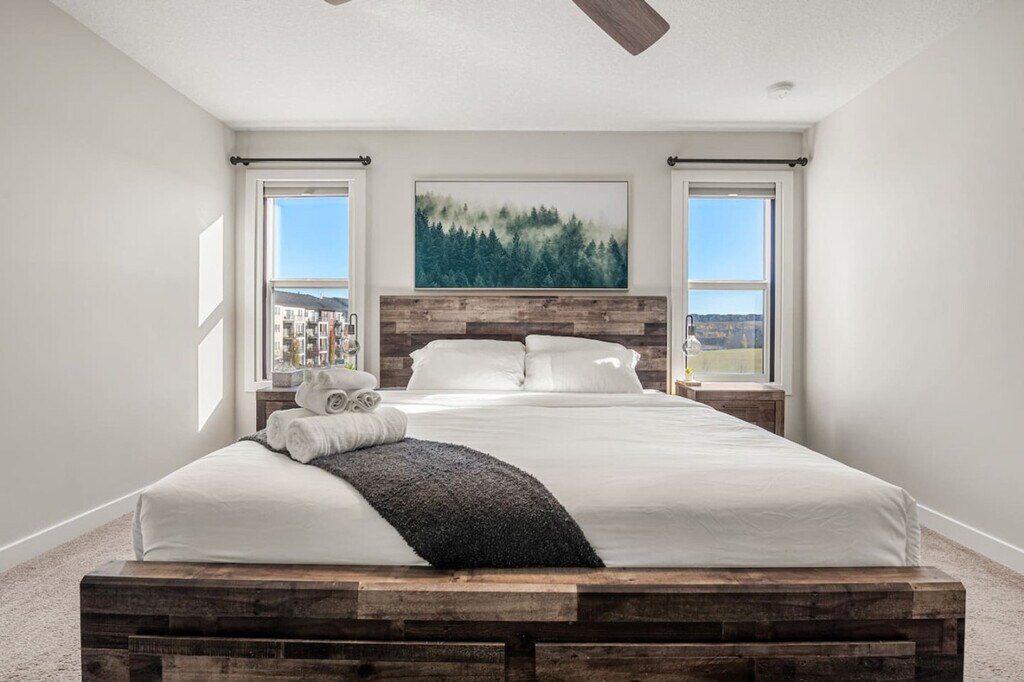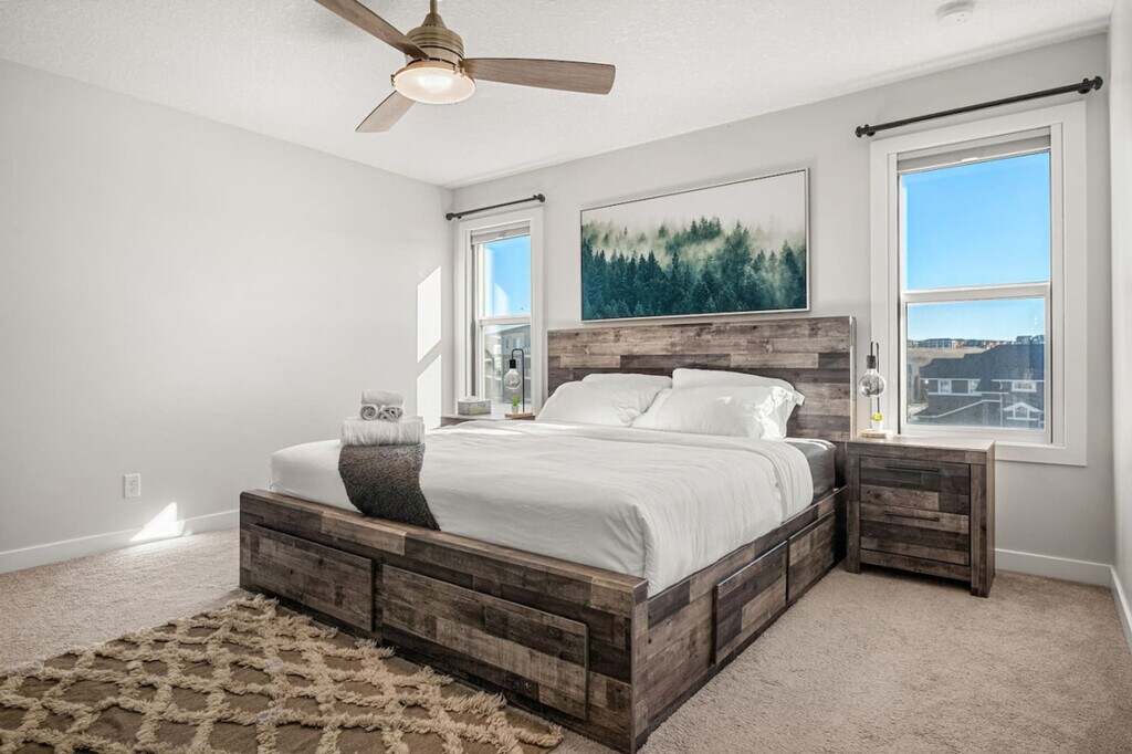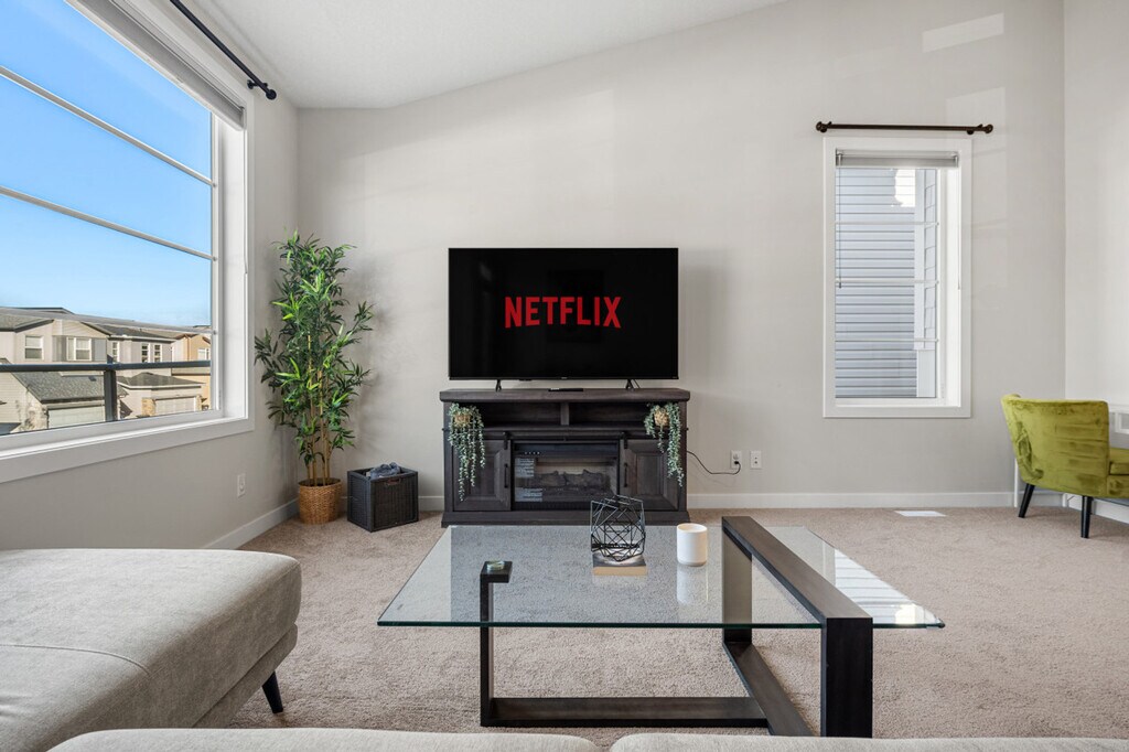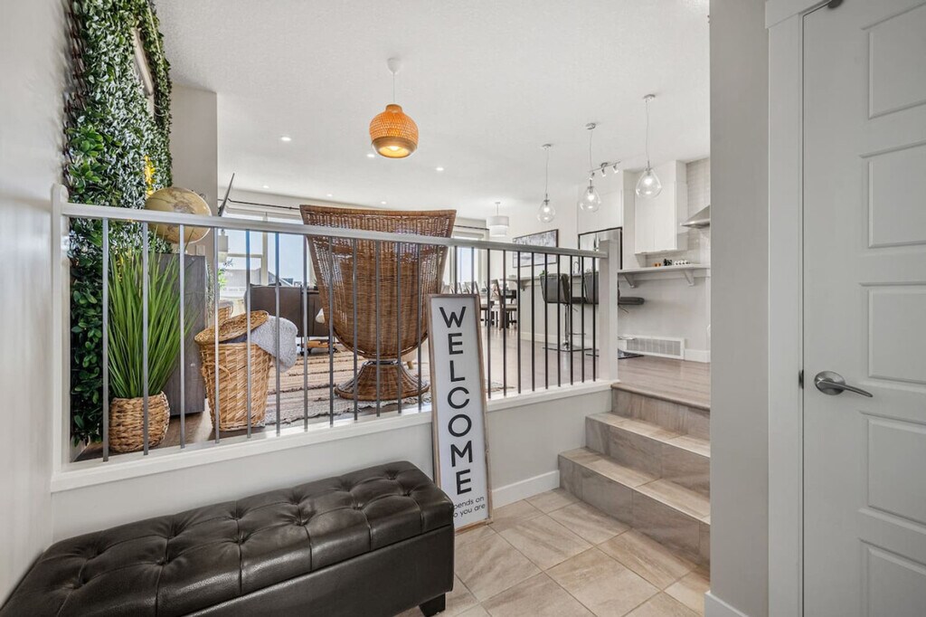 This luxurious and modern retreat in Calgary offers a perfect blend of comfort and style, making you feel at home even when you're away. The apartment features three bedrooms, including a California King with window AC and two Queens, along with two full-size bathrooms and one half bathroom. Enjoy the spaciousness of two living rooms equipped with portable AC, a cozy fireplace, and a fully stocked kitchen. The property also provides free street and driveway parking, high-speed WiFi, and two 65” smart TVs with Netflix. Designed for your convenience, the apartment boasts two inviting living rooms, each with comfortable sofas and large smart TVs. The modern kitchen is equipped with stainless steel appliances, a 4-burner stove, oven, microwave, refrigerator, freezer, and dishwasher. Enjoy complimentary Keurig pods, tea, and Brita water. The dining area on the main floor offers island seating and bar stools, perfect for gatherings. In-unit washer and dryer with detergent provided add to the ease of living. Enhance your stay with optional upgrades like a National Park Entry, Welcome Basket, Birthday Decor Package, Romantic Wine and Flower Package, Spa at Home Package, Movie Night Upgrade, Christmas Tree and Decor, Halloween Decor and Pumpkin Carving Package, Winter Cozy Package, Beer Tasting Kit, Diffuser and Aroma Set, Additional Bedding and Sleeping Arrangements, Grocery Pre-Stocking Service, and Pet Friendly Package. These are subject to availability and may incur additional costs. Located in the vibrant Sage Hill community, this apartment is just minutes away from essential amenities such as Walmart Supercentre, T&T Super Market, and Sage Hill Shopping Centre. With quick access to major highways like Stoney Trail and Trans-Canada Highway, exploring nearby attractions such as Banff, Kananaskis, and Canmore is a breeze. The neighborhood is transit-friendly with Calgary Transit bus services and is continuously developing its pedestrian pathways and local amenities. While the apartment is designed for comfort, you may occasionally hear light activity from a separate basement suite with its own guests. The property enforces a strict no-smoking, no parties, and no shoes inside policy, with a $250 CAD fine for smoking violations. Quiet hours are from 10 pm to 7 am, and noise should be kept under 85db. Unauthorized late check-out will result in additional fees. The unit is thoroughly inspected before your arrival, and any damage to linens, towels, utilities, or equipment upon check-out will incur fees. Guests are responsible for following city guides on garbage disposal, and any infractions will result in fines. The use of the mailbox is not included, but a PO box can be arranged for a fee. If items are left behind, a fee will apply for their return. Events for work or meetings are allowed upon request, but excessive noise or disturbances will lead to eviction. For those working remotely, the apartment offers dedicated workstations with high-speed internet, ensuring a productive environment. A laptop computer is not included. Registration Number: BL274287 [SI]