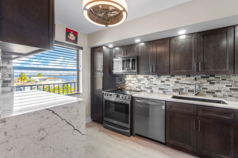 Beautifully remodeled 2/2 condo with a top floor location in this quiet, gated, waterfront community by the intracoastal. Enjoy the water views in front and back from your private balcony. This home has remodeled kitchen and baths, all hurricane impact windows, a new washer and dryer, A/C 2024, custom closets with built-ins, a storage unit and more. An added bonus is the Loggerhead Marina right next door, great for boating enthusiasts. See it today!