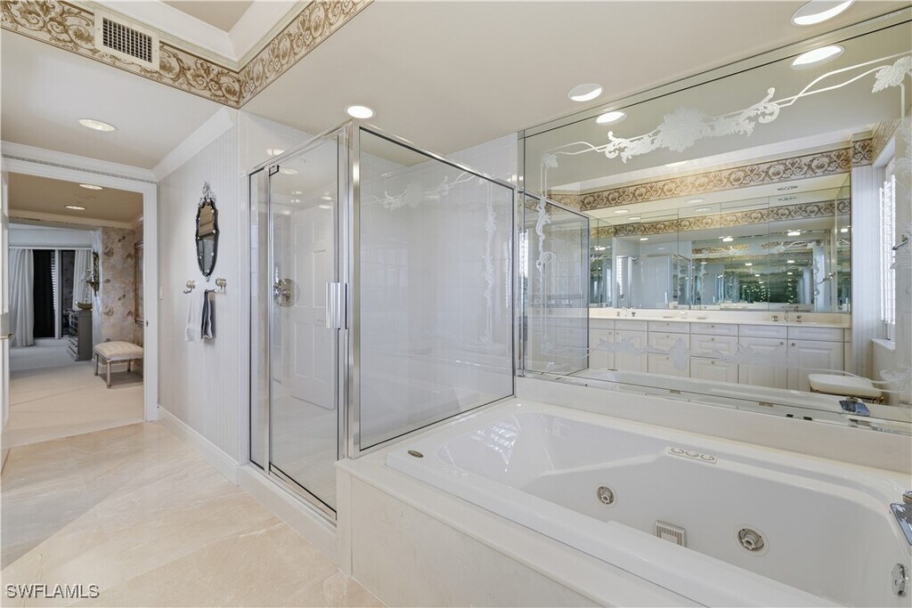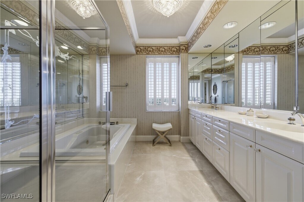 Guests will enjoy the elegant ’s of Marquesa located in the private gated community of Bay Colony. This 10th floor 2 bedroom,3 bath residence overlooks the splendor of the Pelican Bay preserve with long views of the beach and coastline west,north and south! This quiet location offers a full range of amenities,including fitness,a large pool,spa and poolside grill. As a guest in the Marquesa,you have access to the tennis center,and also private Beach Club at Bay Colony,offering fine and casual dining,as well as a beachside pool with lounge service and light fare. This residence offers a spacious master suite,with a king-sized bed,flat screen TV,large walk-in closet,and a master bath on-suite with a large jetted tub,separate shower and dual sinks. The guest suite features 2 full sized beds,a flat screen TV,and guest bath on-suite,with a tub and shower. A 3rd full bath offers a shower. The open study is fully equipped for those who desire a work space. A beautiful kitchen with stone counters and high-end appliances offers a separate dining area with seating for 6. Throughout this property you will find marble flooring,and plush,attractive furnishings for comfortable enjoyment. A spacious screened lanai is fully furnished for relaxing and dining,a fantastic outdoor setting while enjoying the views!