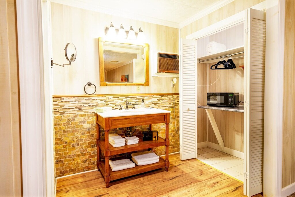Feel at home in this beautiful lodge at the River Front Resort. This room can sleep up to 4 people and features a private front entrance. This beautifully decorated space, designed by a local, features unique furnishings and a warm ambiance. It includes a smart TV perfect for streaming your favorite shows, complimentary coffee and tea, and fast Wi-Fi. The lodge is right on the river, great for fishing or any other wildlife adventures you may have. It's also conveniently located 10 minutes from downtown Elkins and 12 minutes from the Elkins-Randolph Co. Regional Airport. Free parking is available directly across the street. Even though the best Wi-Fi is provided in the area, this place is still in an area that internet isn't perfect, and occasional interruptions may occur. Profiles with a review rating lower than 4 stars will not be allowed to book this property on an instant book basis, and if for whatever reason the reservation confirms through the system, the reservation may be canceled. For guests with new profiles without reviews, these requests will be reviewed manually and will be subject to screening and questioning before a reservation may be confirmed. Please treat the place with respect. If any problems arise, the host will do their best to take action ASAP, but there is no one living on site 24/7. [SI]