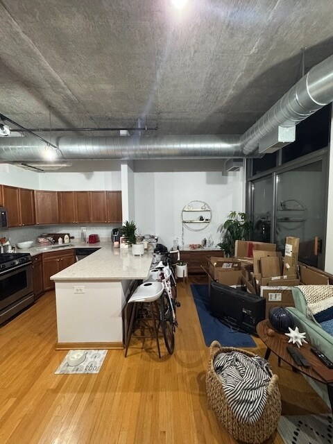 Available March 1st. Spacious River North concrete loft located in a full amenity building. This home features an open concept layout with a large kitchen, living, and dining area, complemented by floor to ceiling windows, 12 foot concrete ceilings, exposed ductwork, and hardwood floors throughout. The updated kitchen offers stainless steel appliances, quartz countertops, a full backsplash, pantry storage, and a breakfast bar perfect for entertaining. The generously sized bedroom includes a large closet, and the bathroom features a soaking tub. Additional storage is abundant with five total closets plus a pantry. Enjoy outdoor space from your private balcony and the convenience of in unit washer and dryer. Full service building amenities include 24 hour door staff, fitness center, and on site dry cleaner. Rent includes gas, internet, basic cable, water, and trash. Heated garage parking and storage are included. A fantastic River North loft offering space, light, and unbeatable convenience.