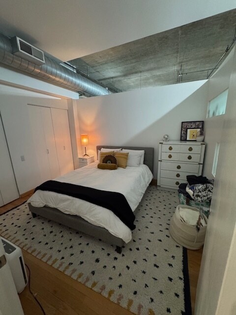This 1 bedroom, 1 bathroom loft apartment features 12-foot concrete ceilings, floor-to-ceiling windows, exposed ductwork, and hardwood floors throughout. The large living, dining, and kitchen area is ideal for entertaining or working from home. The updated kitchen includes stainless steel appliances, quartz countertops, full tile backsplash, pantry storage, and a breakfast bar. The generously sized bedroom offers a large closet, while the bathroom features a soaking tub. Storage is abundant with five closets plus pantry space. Enjoy private outdoor space from your balcony and the convenience of an in-unit washer and dryer.