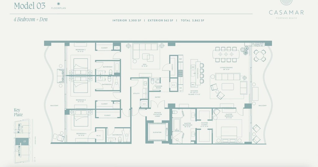 Experience unparalleled oceanfront living at Casamar,Pompano Beach's newest luxury condominium. This spacious 4-bedroom,4.5-bath plus den residence offers up to 11 ft. ceilings,3,300 sq. ft. of interior space and 562 sq. ft. of outdoor terraces,totaling 3,862 sq. ft. of exquisite coastal living. The flow-through layout features floor-to-ceiling glass showcasing breathtaking Atlantic Ocean and Intracoastal views,perfect for enjoying both sunrises & sunsets. Elegant upgrades include porcelain flooring,custom Italkraft kitchen cabinetry,and Wolf and Sub-Zero appliances with a natural gas cooktop. Residents of Casamar enjoy resort-style amenities including sunrise and sunset pools,a state-of-the-art fitness center,pickleball court,golf simulator,spa,game room and more. MLS ID R11168961