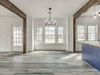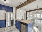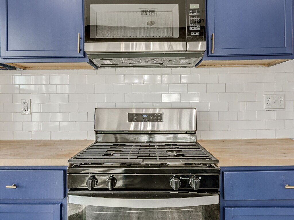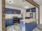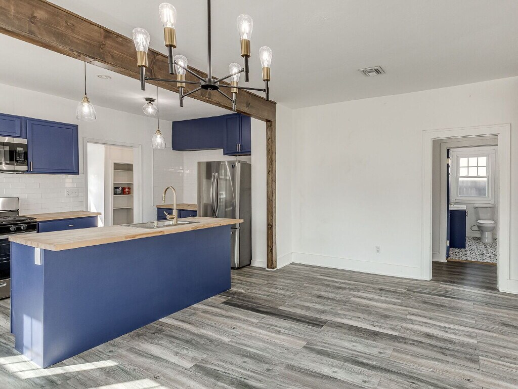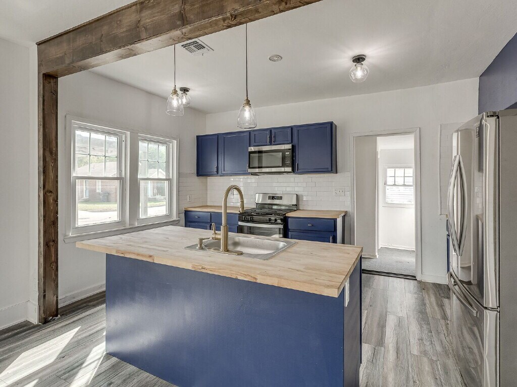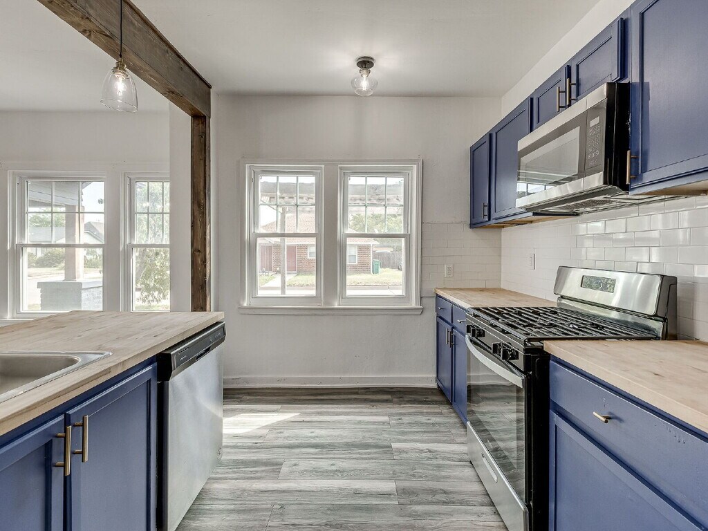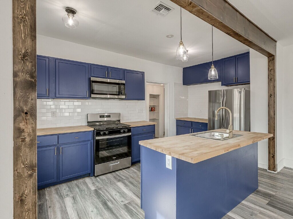 Charming and completely renovated 1930s bungalow in the heart of Oklahoma City! This 2-bed, 2-bath home beautifully blends classic character with modern updates, offering 1,405 sq. ft. of bright, open living space. Step inside to find fresh interiors with luxury vinyl plank flooring, high ceilings with exposed beams, and abundant natural light throughout. The show-stopping kitchen features rich blue cabinetry, a butcher block island, subway tile backsplash, and stainless-steel appliances — perfect for entertaining or casual everyday living. Both bedrooms are spacious with updated bathrooms nearby, while the primary suite includes a private en-suite bath. Outside, enjoy the inviting covered front porch and. A detached secondary structure with a bathroom (no HVAC) offers flexible space for storage, hobbies, or a workshop. Conveniently located near downtown OKC, Paseo, and major highways — this stylish home delivers the perfect combination of vintage charm and modern comfort.Fridge/Freezer Combo Oven/Range