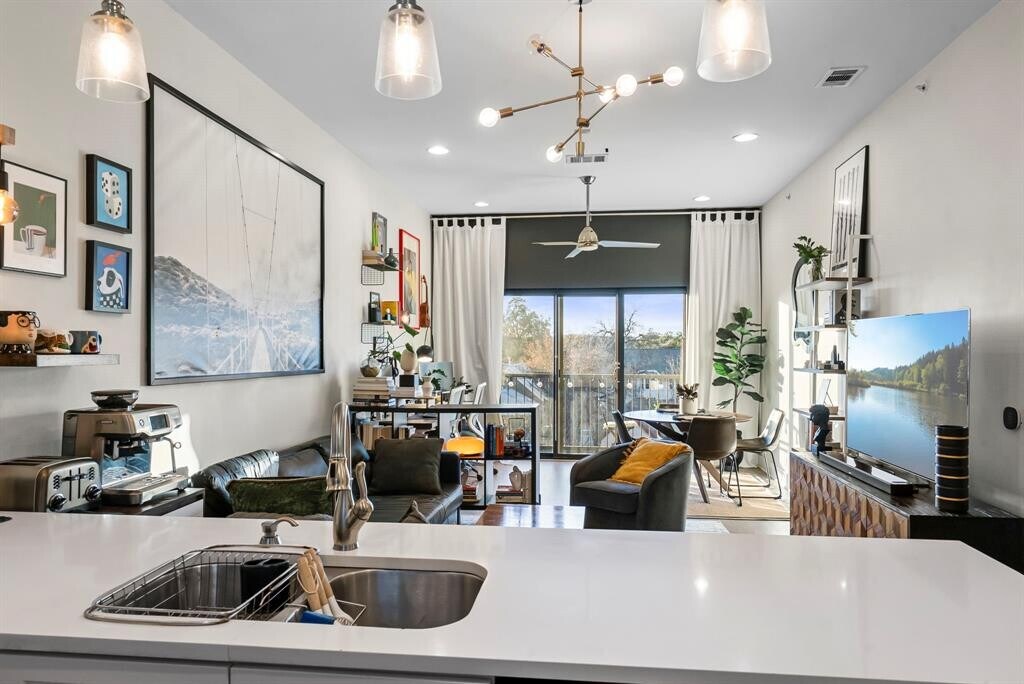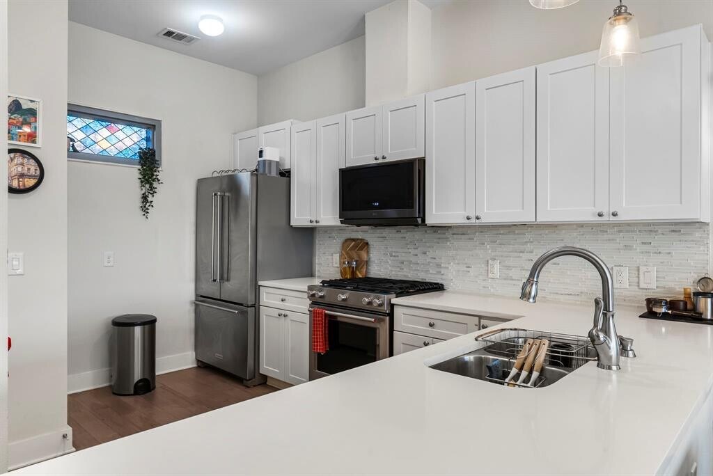 Gorgeous condo with open-concept living, wood floors throughout, high ceilings, and recessed lighting. The kitchen features shaker-style cabinetry, quartz countertops, stainless steel appliances, and a gas range. Stackable washer and dryer are conveniently located in the kitchen along with a pantry. The primary bedroom offers a ceiling fan and two walk-in closets. Additional highlights include a tankless water heater, coat/shoe closet at the entry, and a private balcony. One assigned garage parking space included (#23). Google Fiber and AT&T Fiber available. Pets allowed with deposit and monthly pet rent. Flexible move-in timeline with 2 weeks notice. Apply with RentSpree: . MLS ID 8435712