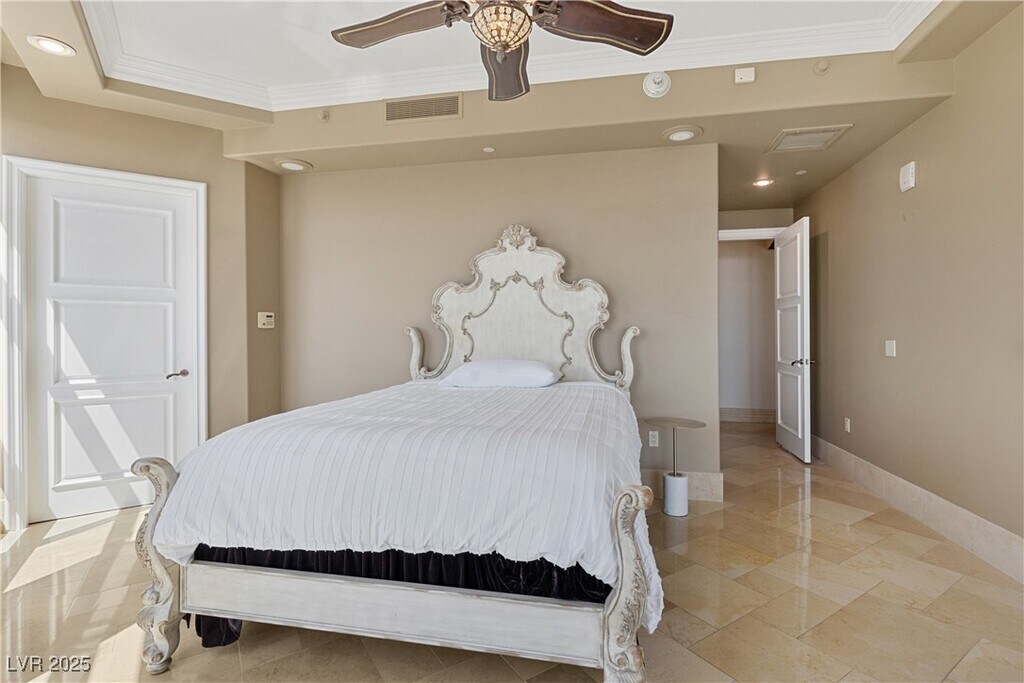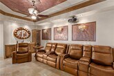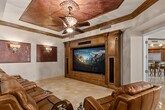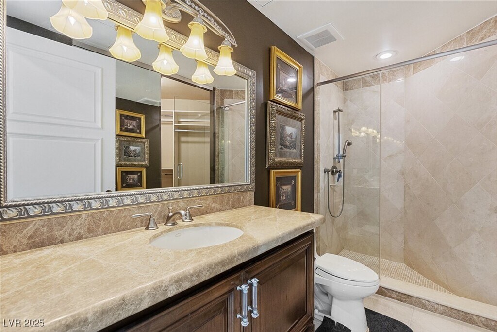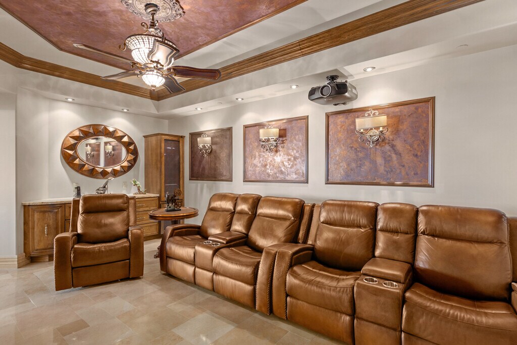 Property has been updated with new furniture. Experience elevated living in this luxurious 3-bed, 3.5-ba + den + office, impeccably designed with custom fixtures & lavish finishes thru-out, this sophisticated home blends style & comfort effortlessly. The chef’s kitchen has been completely reimagined, featuring elegant marble countertops, treated cabinetry, high-end hardware & SS Viking appliance suite, perfect for culinary enthusiasts. The primary suite is a tranquil retreat, offering a spa-inspired bath adorned with stunning slabs & designer fixtures. Designed for both relaxation & entertainment, this residence boasts a first-class private theater with luxury reclining seating & a separate home office. Electronic shades & a full-sized washer & dryer add convenience, while a private enclosed 2 car garage ensures security & exclusivity. Indulge in the ultimate Queensridge lifestyle, where sophistication meets modern luxury in one of Las Vegas’ most coveted high-rises.