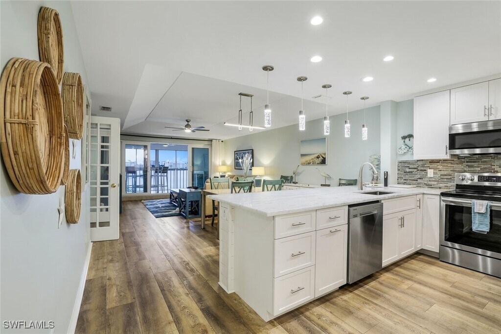 STAY AND PLAY,right here in Chateau Vanderbilt,where WIDE-OPEN WATERFRONT VIEWS swaddle this coastal abode on VANDERBILT BAY. The 2 bedroom,2 bath residence offers an open layout with thoughtfully curated furnishings and finishes in a light coastal palette,perfectly setting the tone for your beach vacation! The kitchen has new white cabinetry,backsplash,and granite countertops and overlooks the combined dining and living areas with straight-through views to the expansive bayfront lanai. Chateau Vanderbilt has a phenomenal location just around the corner from Vanderbilt Beach and near a plethora of fine,casual,and outdoor dining options,as well as upscale shopping at Mercato,Pavilion,Waterside Shops,and more. The community has under-building parking,a saltwater swimming pool on the bay,and tennis courts are available just up the street. Naples offers unlimited opportunities for enjoying the tropical lifestyle Southwest Florida is famous for,including fishing,sunset cruises,Naples Botanical Gardens,Naples Zoo,and public golf courses. The arts are also nearby at Artis Naples. Book now,as this one is every vacationer’s dream!