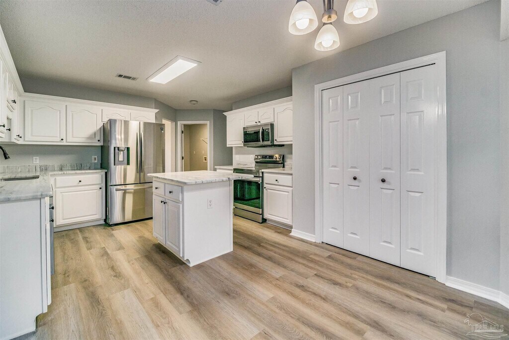 This 3 bedroom 2 bath home is conveniently located to NAS Pensacola and the Perdido Key beaches. An inviting front porch welcomes you into an open floor plan brick home with vaulted ceilings and oversized windows for lots of natural light. This home features new luxury vinyl plank flooring throughout the whole house. There is a bonus room that could be used as an office space or playroom as you enter the house. The upgraded kitchen features new Silver Fantasy granite, new stainless appliances, pantry storage & eat-in dining! The dining area opens right off the kitchen and into the living area which features beautiful high ceilings. The living room is light and bright opening out to the large tiled Florida room. The backyard is fully fenced with a shed. The owner's suite is spacious with a dual sink vanity as well as a large soaker tub and separate shower. There are separate his and hers large walk-in closets! Two guest rooms & full guest bath. Indoor laundry/mud room features added storage. Attached 2 car garage. Check out the virtual tour, and make your appointment today!