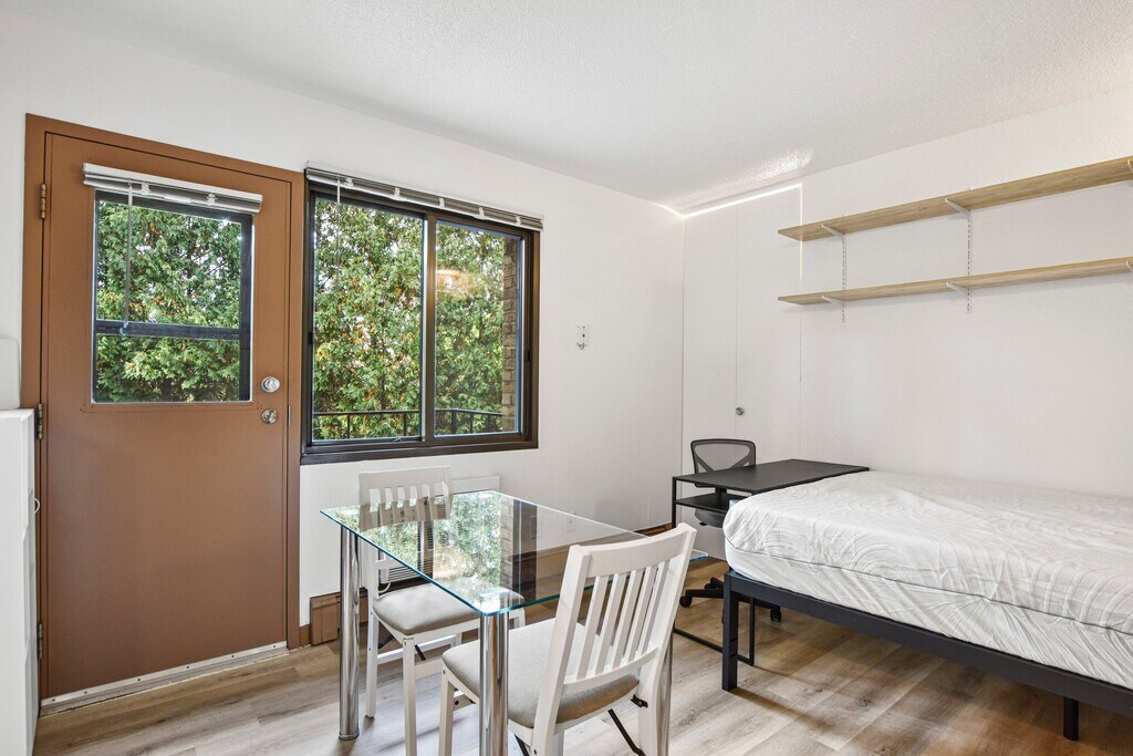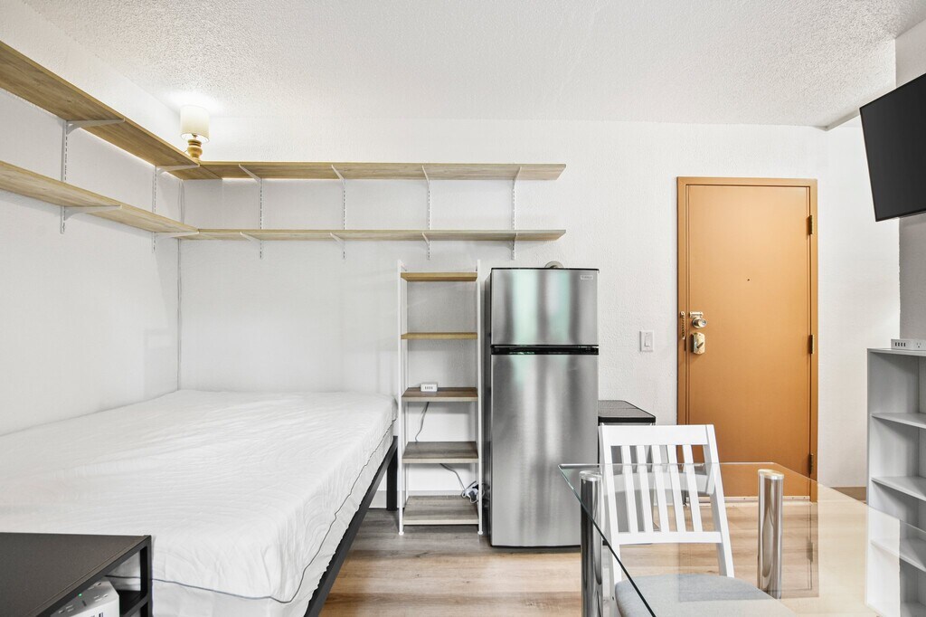 Brand new and smartly decorated studio with many storages. The unit is equipped with dining table and office desk. One cat allowed.