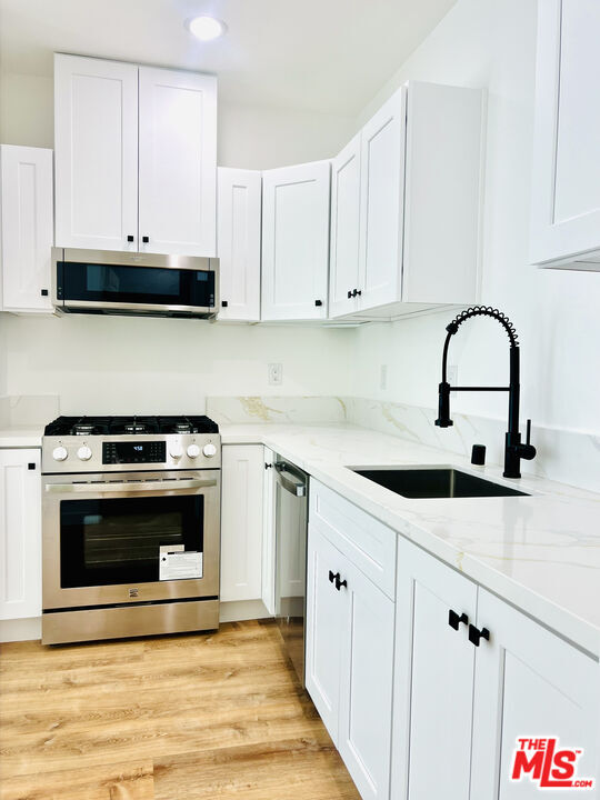 Dont miss this unique one bedroom one bath compact ADU in the best part of Northwest Glendale. Classic traditional has been completely refreshed and features gorgeous early 1950's details including antique iron railings, stone walkways and framed entry doors with lovely pediments. Enjoy NEW CONSTRUCTION with incredible light and bright unit the best new finishes throughout including all NEW distressed style hardwood floors, large double pane windows, newly installed AC and heat with remote and recessed lighting and more! Kitchen has new crisp white cabinetry and all stainless steel appliances with refrigerator, stove, microwave, dishwasher and gas stove. Small dining area off of kitcken. Lovely bedroom with a big bright window and closet with mirrored closet doors. Gorgeous bathroom has new vanity with adjustable lighting and custom tiled bath. New stacked Washer Dryer! Good parking available on wide spacious residential street and permit parking ($35 a year) is availble just south of building. Friendly pets welcome. Professionally managed and a fantastic opportunity for those seeking a comfortable and stylish living space with true charm and modern updates. MLS# 25599443