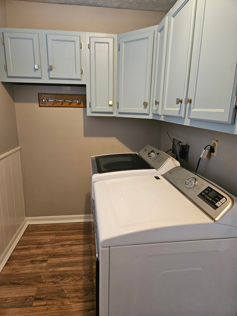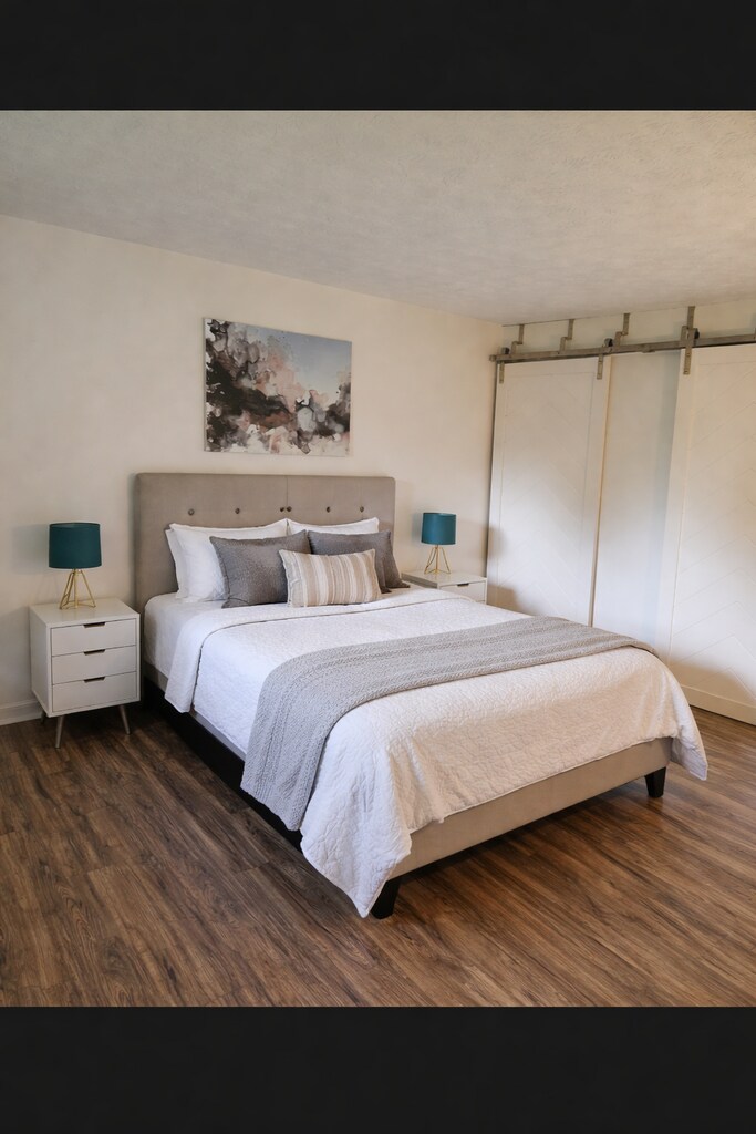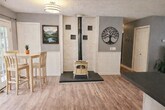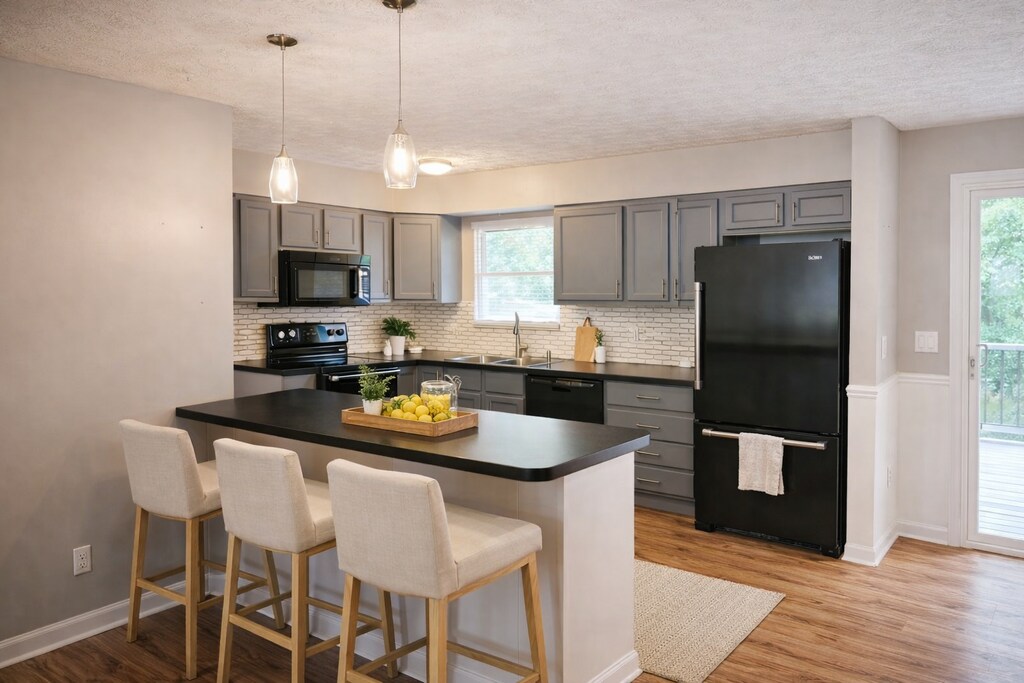 Welcome home to this beautifully updated, open-concept residence featuring stylish blue kitchen cabinetry and modern finishes throughout. The kitchen is the heart of the home, showcasing sleek black appliances, a contemporary tile backsplash, and a spacious breakfast bar—perfect for casual dining and entertaining. The living and dining areas flow seamlessly, highlighted by durable wood-style flooring, neutral designer wall colors, and abundant natural light. A charming wood-burning stove adds warmth and character, creating a cozy focal point for relaxing evenings. With its clean lines, thoughtful updates, and functional layout, this home offers both comfort and style. Conveniently located near shopping, dining, and major routes, it’s a move-in-ready space ideal for those seeking modern living with unique character.