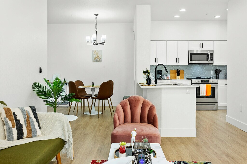 Feel at home in this newly built condo in Glendale that is steps away from the stadium and some of the best shopping, dining, and golf courses in greater Phoenix! This garden-style unit requires climbing one to two flights of stairs. Please reach out if you require a ground floor unit. This apartment is suitable for a family, group of friends, or business travelers and has all of the amenities necessary to enjoy your stay. Great amenities await you, including a resort-style heated pool, a jacuzzi hot tub, a fitness center, a large outdoor fireplace, a BBQ area, and an arcade. The apartment also features quartz countertops, stainless steel appliances, a fully equipped kitchen, 100mbps+ internet, modern decor, a Smart-TV with streaming apps installed, a washer/dryer, complimentary coffee, and a patio. Pets are welcome with an additional fee of $100-300 based on stay length. Ideally located close to different attractions, this apartment is in Glendale, right in the Westgate entertainment area. Enjoy live music, movies, football, and dining all in one place, just across the street from the building. It is also a quick drive or Uber/Lyft ride to other attractions. Smoking, of any kind, is not permitted within or outside of the apartment, including balconies, patios, or common and/or parking areas. Any sign of smoking is a violation of the stay agreement, which may result in immediate termination and recovery fees beginning at $500. There is a $200 penalty for removing smoke detectors and a $200 penalty for lost key fobs. No outside guests are allowed without permission. Quiet hours are between 9pm and 8am. Check-in is at 4 PM and check-out is at 11 AM (with a $75/hr late fee). [SI]