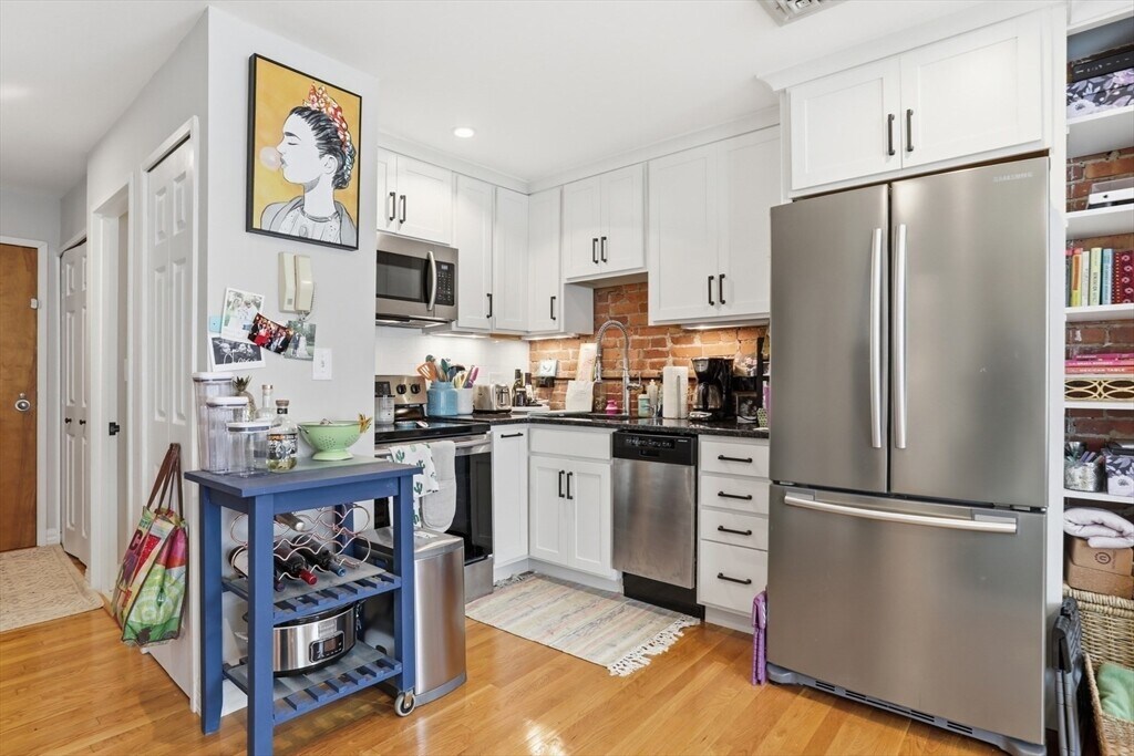 Sunny-side,front-facing third-floor unit in elevator building on Gainsborough Street available for May 1st lease start date. Beautifully renovated,this home features an open-concept layout,hardwood floors,and recessed lighting throughout. The kitchen is set against an exposed brick wall and outfitted with all-white American Woodmark cabinetry,steel gray granite countertops,and stainless steel appliances. Relax by the fireplace or enjoy views of the tree-lined street through one of two oversized bay windows in the living area. The tiled bathroom offers a glass-enclosed shower with dual shower heads,and the generously sized bedroom features floor-to-ceiling exposed brick and custom built-in closets. Additional highlights include central air and in-unit laundry. Ideally located just off Storrow Drive at the crossroads of Northeastern,Fenway,and Back Bay,it truly is a commuter’s dream. This unit checks all the boxes and is not to be missed! MLS# 73484484