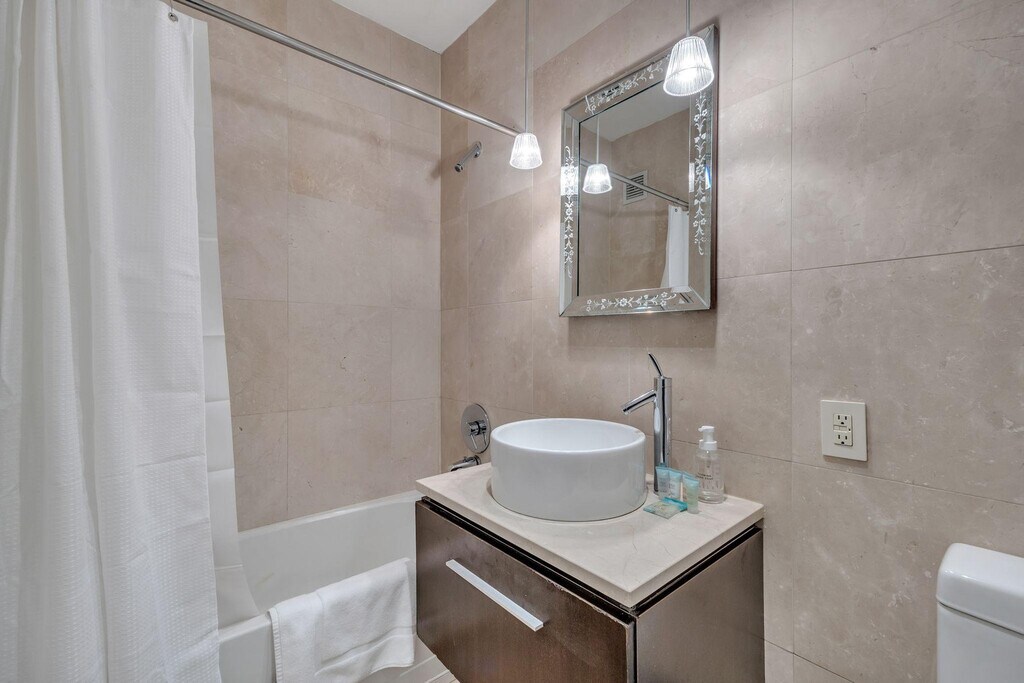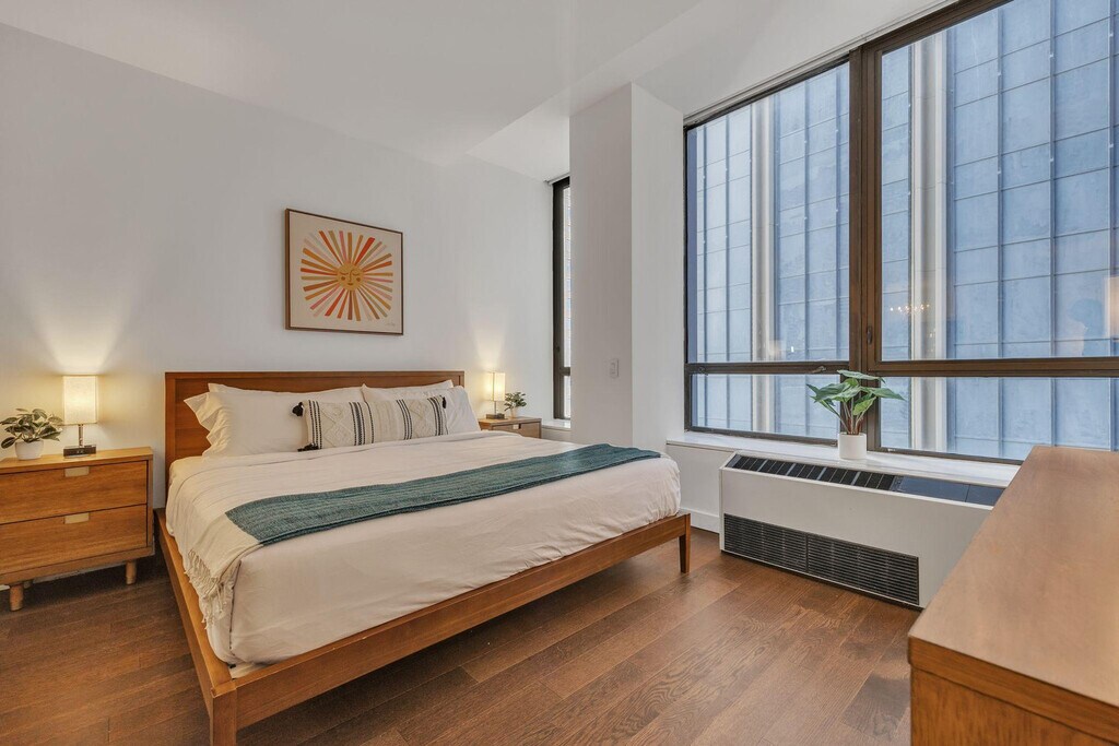 Experience the heart of the financial district with this luxurious apartment at 95 Wall, offering spectacular rooftop terrace views and a state-of-the-art fitness center. Conveniently located, you can stroll to work, jog to The Battery, or quickly access the FDR, making it the perfect home for those who value both luxury and comfort. Custom designed for the remote worker, this newly renovated unit features a fully equipped kitchen, a king-size mattress, a full bathroom, a smart TV, and all utilities. The apartment also boasts a full home office set-up with private high-speed internet, ensuring a productive and inspiring environment. While parking is not provided, it may be available via the attached public indoor garage, which guests must coordinate independently. Other garage parking options are also available nearby. Early check-in from 9am-3pm incurs a fee of $75, before 9am incurs a fee of one full night's rent, late check-in after 8pm incurs a fee of $50, late check-out from 11am-3pm incurs a fee of $75, and after 3pm incurs a fee of one full night's rent. Situated in a prime location, the apartment is just one block from the ferry port and has a Walgreens Pharmacy on the ground floor. Starbucks Coffee is conveniently located on the same block at 99 Wall St, making it easy to grab your morning coffee before starting your day. The building is currently undergoing renovation, expected to continue until Spring 2026. Internet speeds are not guaranteed and may fluctuate based on your computer model and the router location. The dryers in the shared laundry facilities are currently undergoing repairs and are out of service, but in-unit laundry is provided. Includes private high-speed internet, a standing desk (Uplift), a work chair (Uplift), a 34-inch ultra-wide monitor (Samsung), a microphone (Blue Yeti), a webcam (Logitech), computer speakers (Logitech), an LED streaming light, a green screen, a keyboard (Logitech), a mouse (Logitech), a laptop stand, and a TOTU 16-in-1 Triple Display USB-C 3.1 Docking Station. A laptop computer is not included. [SI]