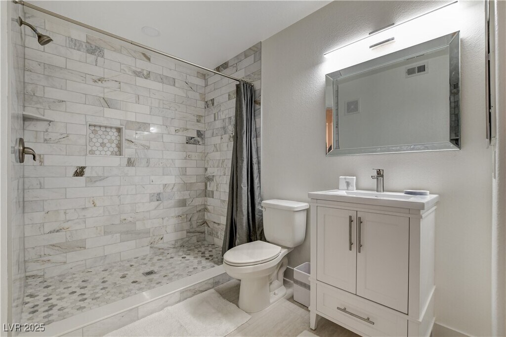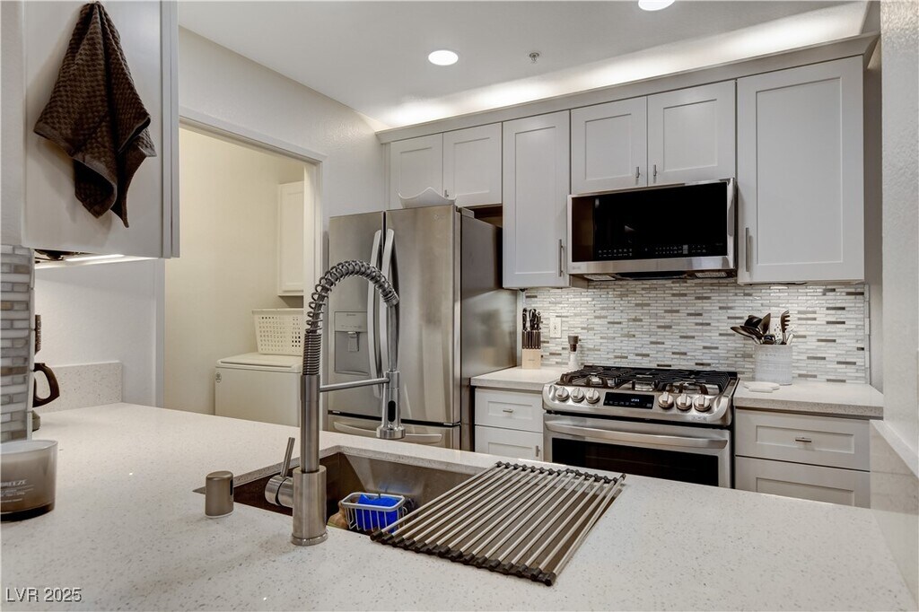 Welcome to this beautifully updated second-floor 3-bedroom, 2-bath residence located in a highly convenient Henderson neighborhood just minutes from major shopping, dining, hospital facilities, and easy freeway access. This home features a spacious primary suite with a king bed and private full bath, plus two additional bedrooms—one with a queen bed and one with a full bed—served by a hallway bathroom. The open-concept living and dining area provides excellent natural light and comfortable flow, and the fully equipped kitchen offers generous counter space and modern appliances. Additional conveniences include an in-unit washer and dryer, high-speed WiFi, free on-site parking, and a keypad entry system for secure access. The community also offers a seasonal swimming pool. With no upstairs neighbors, this unit provides added privacy and quiet. This property is suitable for long-term or mid-term residency and is available fully furnished.