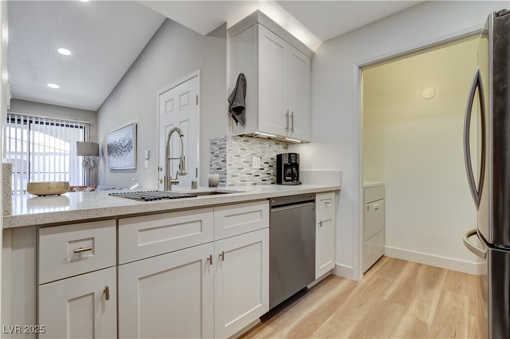 Experience modern living in this fully upgraded one-bedroom condo within a secure gated community. The open floor plan creates a bright, welcoming atmosphere, complemented by a beautifully renovated kitchen featuring granite countertops, white cabinetry with ample storage, and stainless steel appliances. The spacious bedroom offers comfort and relaxation, while the updated bathroom includes new counters and a sleek tub-shower combination. Located on the upper level, this home provides added privacy and access to a range of community amenities for a comfortable and convenient lifestyle.