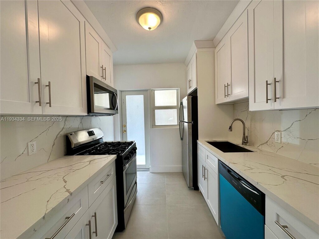 Brand new everything. Sparkling, immaculate and fully renovated ground-floor unit featuring gleaming new floors, a gorgeous stainless steel and quartz kitchen with new cabinets, a dishwasher and gas range, impact windows and doors throughout, walk-in closets and a gorgeous bathroom blanketed in Italian porcelain. Incredible natural light in this unit and great outdoor space off the kitchen balcony. The building is impeccably maintained with laundry in back and a fresh paint job. The location could not be better on tree-lined Bay Drive, just steps to the posh Normandy Isle fountain, farmers market, sushi, gelato, happy hour spots and the beach. Call today, very easy to show and a very easy and fast approval process. MLS # A11934334