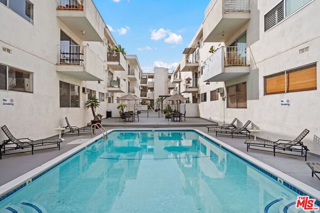 Beautifully bright and quiet corner unit with only one shared wall, ideally situated between Sunset Plaza and Santa Monica Blvd in the heart of West Hollywood. This updated and freshly painted home features spacious rooms with light wood laminate flooring, recessed lighting, and abundant storage throughout. The kitchen is equipped with stainless steel appliances including refrigerator, dishwasher, range, and microwave, plus elegant stone countertops and crisp white cabinetry. A dining area connects the kitchen to a private balcony overlooking the peaceful courtyard, perfect for morning coffee or evening relaxation. The generously sized primary suite enjoys a large window that fills the room with natural light, excellent closet space, and a beautiful bathroom complete with new cabinetry and soaking tub with shower. Building amenities include a sunny pool with lounge seating, exercise room with up-to-date equipment, a spectacular rooftop deck offering 180-degree city views, ideal for relaxing or entertaining guests. Additional highlights include one conveniently located parking space and storage unit near the entrance, guest parking, and a community laundry area. Located moments from world-class dining, shopping, and entertainment, with easy access to The Grove, Beverly Center, and Cedars-Sinai. Experience the best of West Hollywood living. MLS# 26640915
