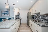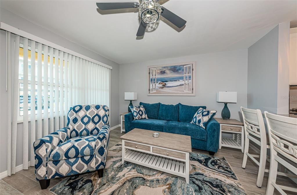 Beautifully updated and Fully Furnished condo just steps to the sand!! Treasure Island Getaway one block from the beach. One bedroom one bath condo on the first floor with assigned parking next to front door. Well designed Kitchen with custom cabinets and granite countertops,brand new appliances with Built in Microwave. Porcelain tile flooring throughout!! No steps to climb. Amenities include Water Front complex,Dock to fish or day park your boat,Block construction,Laundry room close to unit. Water,sewage,trash,included with rent.
