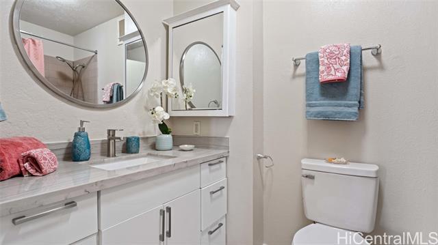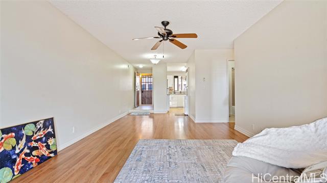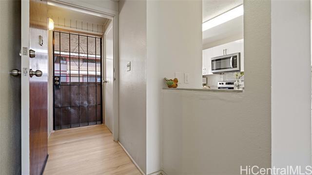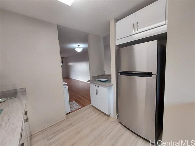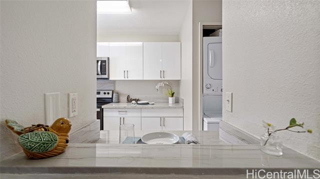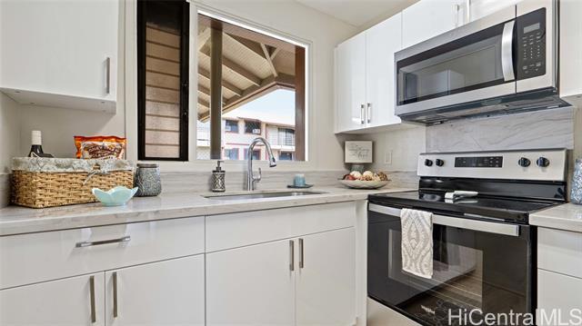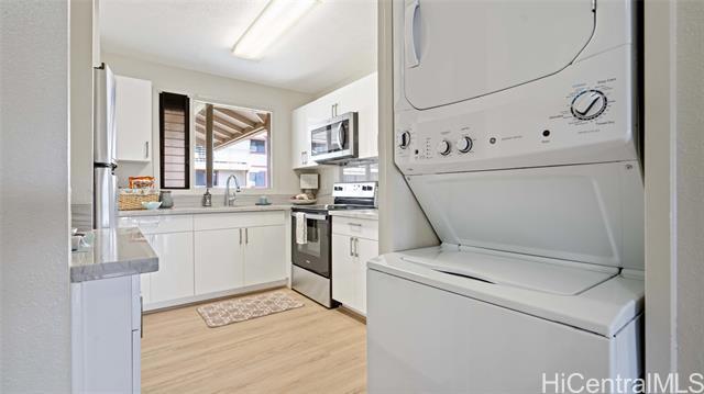 Don't miss this UNFURNISHED 3rd floor (stairwell access only) charming 2-bedroom, 1-bathroom residence recently remodeled with new white kitchen, stainless steel appliances, and larger sized washer/dryer in the living room. Unit comes with 2 parking spaces right in front of the unit, community pool, BBQ area and guest parking. Sweeping views of Pearl Harbor and stunning sunsets right from the private lanai, Pearlridge Mall and surrounding shops and restaurants nearby. Ceiling fans and window AC unit ensure year-round comfort. Tenant pays electricity, cable/internet in addition to rent. 1 year lease to start, sorry no smoking of any kind in the unit and no pets. Renter's insurance required. Available now for immediate move in.