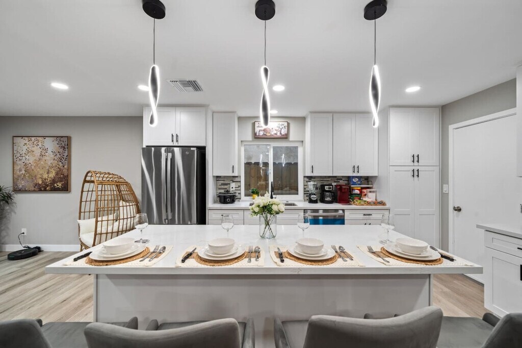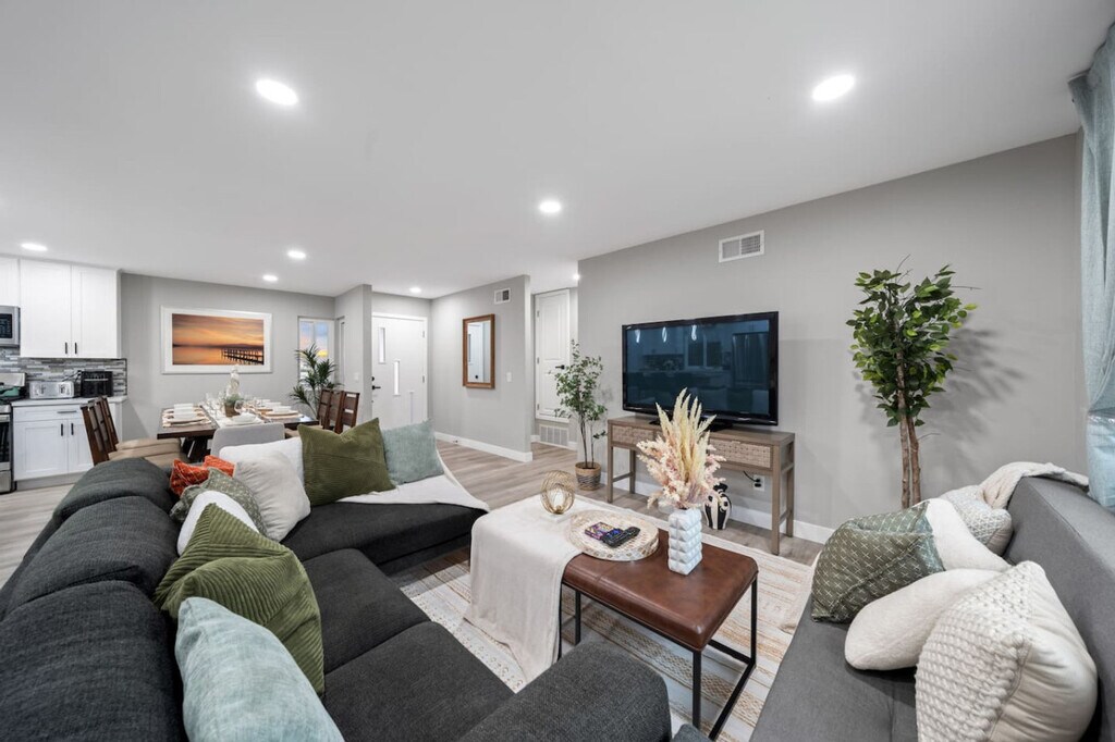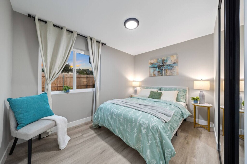 Welcome to this charming family home in Spring Valley, San Diego, where you can feel at home with a king bedroom featuring a workspace and en-suite bathroom with a walk-in shower. Enjoy the convenience of a fully stocked kitchen and a gated backyard with a grill, perfect for both short-term and long-term stays. The property offers easy access to shopping centers and local restaurants, just 5-10 minutes away. The kitchen is equipped with all modern appliances, including a coffee machine, and stocked with essentials like coffee, cooking oil, sugar, and salt. The air-conditioned living area features flat-screen smart TVs with cable and streaming services, as well as a game console for entertainment. The fully stocked bathroom includes a walk-in shower, bathtub, shampoo, body wash, a hairdryer, and fresh towels. This home offers free parking for two cars, with additional space available on the long curb in front of the house. Pets are welcome, and early check-in or late check-out is available for a small fee. Extra guests are allowed for a fee, and each visitor is counted as half a guest. Nestled in a peaceful neighborhood, this home is a gateway to San Diego's iconic attractions. Explore Balboa Park, the San Diego Zoo, Old Town San Diego State Historic Park, and the USS Midway Museum. Enjoy breathtaking views at the Cabrillo National Monument or stroll through the Gaslamp Quarter. Seaport Village, Coronado Beach, and Petco Park are just a short drive away. Public transportation is easily accessible, and the area offers on-demand electric scooters and bikes. The property features a security camera at the front door and a noise decibel monitor outside the house to ensure a peaceful stay. Self-check-in is available via lockbox or keypad, with instructions sent at noon on your check-in day. To avoid neighbor complaints, maintain low noise levels, especially after 9 PM, and keep activities inside with doors and windows closed. Unauthorized guests or pets will incur a $100 per night penalty, and late check-out without prior approval will be fined twice the nightly rate. Please dispose of trash properly and report any damages immediately. No food is allowed in bedrooms to maintain cleanliness. The home is remote work-friendly with 500Mbps Wi-Fi, making it easy to host online meetings or share large files. The king bedroom includes a workspace for your convenience.