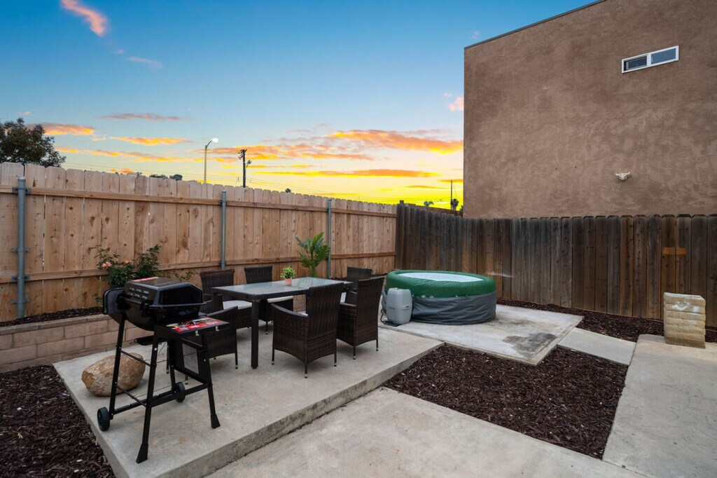 Welcome to this inviting family home in Spring Valley, San Diego. This ranch-style 3-bedroom house spans 1,500 sqft and offers parking for up to three vehicles in the garage and driveway. Enjoy the gated backyard complete with a hot tub, grill, and games, perfect for relaxation and entertainment. Feel at home in this peaceful oasis, ideally located just 5-10 minutes from shopping centers and local restaurants. The kitchen is equipped with all the modern appliances you would expect, including a coffee machine. Essentials like coffee, cooking oil, sugar, and salt are provided. Enjoy your meals at dining tables and chairs both inside and outside, accommodating up to 16 people. The living area is air-conditioned and features flat-screen smart TVs with cable and streaming services, as well as a game console for entertainment. Pets are welcome, and there is free parking for two cars with additional space on the curb. Early check-in or late check-out is available for a small fee. Additional guests beyond the platform limit can be accommodated for a small fee, and each visitor is counted as half a guest. Nestled in the heart of Spring Valley, this home offers tranquility and convenience, making it ideal for both short-term and long-term stays. Explore nearby hiking trails like Rock House and Wildlife Refuge, or enjoy a variety of dining options including Mexican, Chinese, Filipino, Japanese, and Korean restaurants. Discover San Diego's iconic attractions such as Balboa Park, the San Diego Zoo, and the USS Midway Museum, all within easy reach. Public transportation is accessible with a bus stop within walking distance. The home features a self-check-in process via lockbox or keypad, with instructions sent at noon on your check-in day. Noise levels must be kept low to avoid neighbor complaints, especially after 9 PM, with a $1,000 penalty for violations. Unauthorized guests or pets incur a $100 per night penalty. Late checkout without prior approval will be fined at twice the nightly rate. Please report any damages immediately and dispose of trash properly. Smoking, illegal activities, and food in bedrooms are prohibited. Ensure all windows and doors are locked when leaving. The property has a security camera at the front door and a noise monitor outside to protect guests and the home. The home is remote work-friendly, offering a choice of desks and chairs inside and outside, along with 500Mbps Wi-Fi, making it easy to host online meetings or share large files.