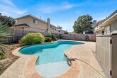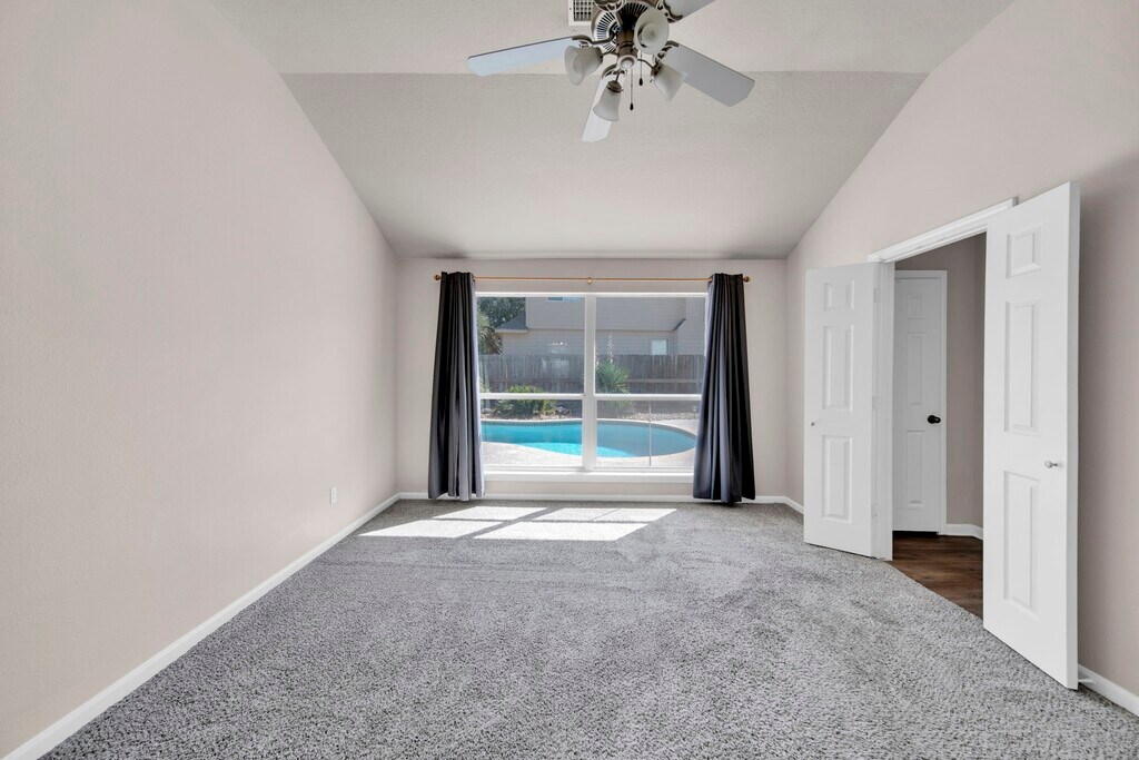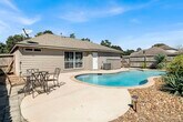Beautiful formal entry awaits your decor when you enter the front door. The living room is spacious providing plenty of room for your furnishings. Appreciate the kitchen details- full size refrigerator, gas stove/oven, dishwasher & microwave with an island for additional counter space to prepare meals & 2 pantry spaces. Primary bedroom has high ceilings & large windows with black out curtains included. The primary bathroom has two sinks & large soaking tub with access to the huge walk in closet. Secondary bedrooms located on the west side of the house both w/ceiling fans & carpeted flooring. Secondary bathroom is located near living room & secondary bedrooms. Laundry area is located near dining room including full size washer and dryer. Two car garage has storage shelves and containers included. Cool off during the warm days by swimming in the pool, beautifully landscaped w/patio set included.