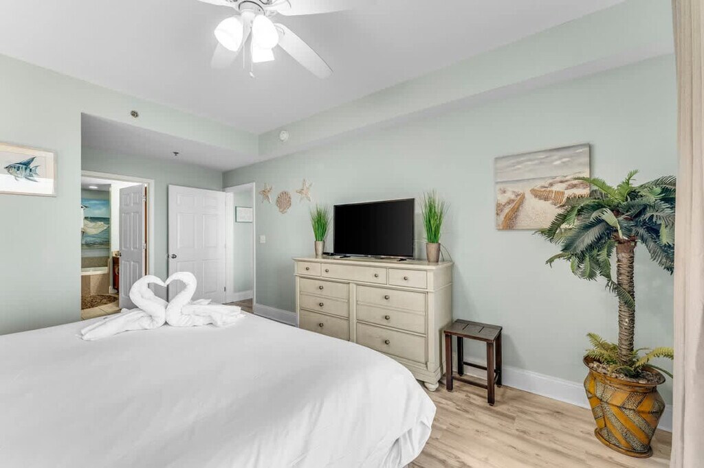 Feel at home in this bright Panama City Beach condo, offering ocean views. This 2-bedroom, 2-bath apartment sleeps 8. This beachside condo has everything you need for a memorable Florida retreat, including free Wi-Fi, a fully equipped kitchen, cable, a private washer/dryer, and central AC. Start your day with a workout in the on-site gym, or a stroll on the lakefront boardwalk, then relax by one of the five pools. Ease your muscles in the shared hot tub and watch the waves roll in from the balcony. Registration for your parking pass is required and the registration fee is paid directly to the resort: Two Bedroom $100.41. Located at Laketown Wharf, you'll be steps from the beaches and Pineapple Willy's. This property also has several shops and restaurants on-site. Wonderworks, Coconut Creek Family Fun Park, and Ripley's Believe It Or Not are less than a mile away. Walmart is a 5-minute walk or a 2-minute drive away. Check-in is at 4 PM CT (5 PM Spring Break and Major Holidays). The minimum age requirement is 18+. Per PCB Ordinance 1632, the maximum occupancy is 8 guests including children and infants. Failure to abide by the ordinance may result in fines and ejection. [SI]