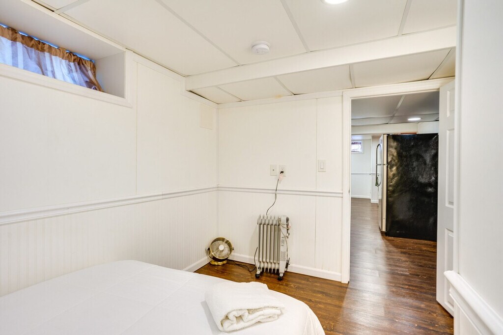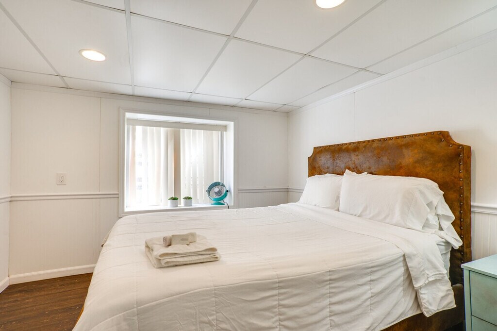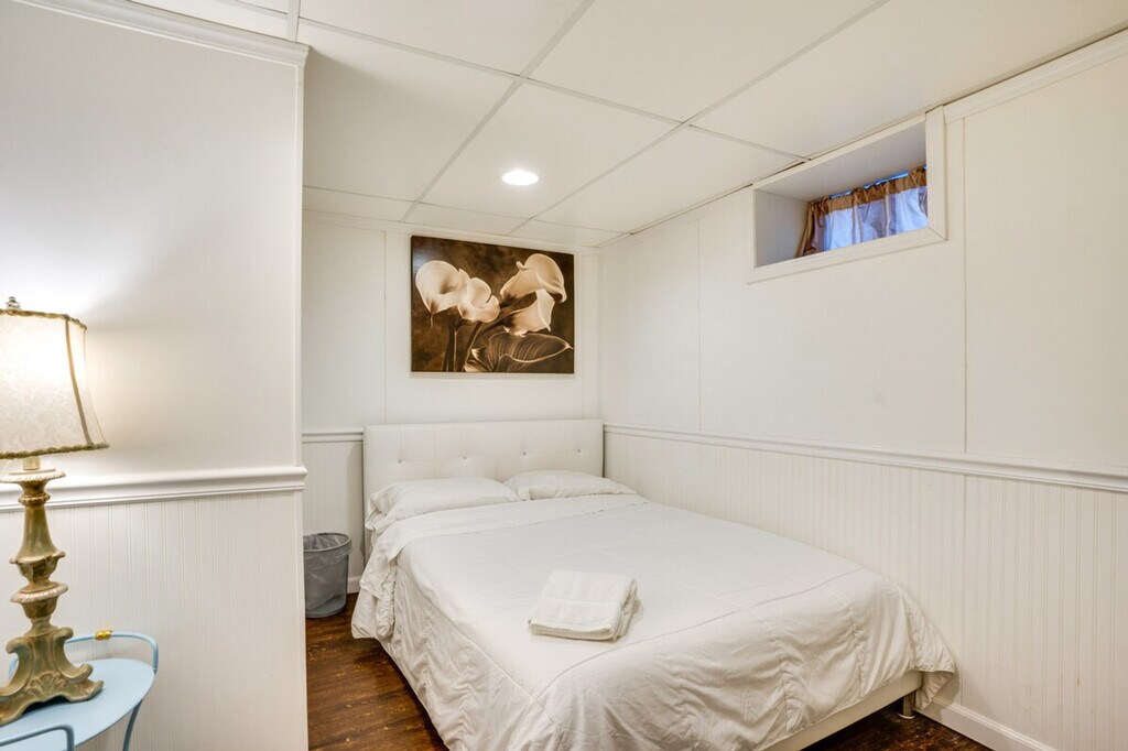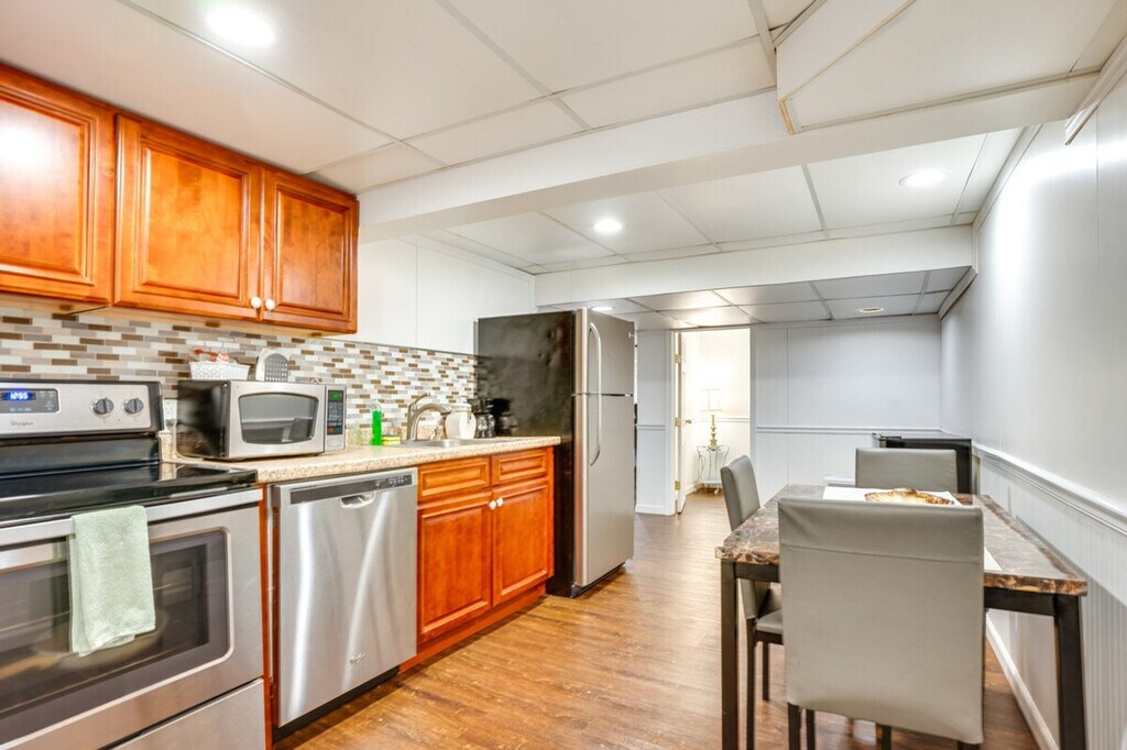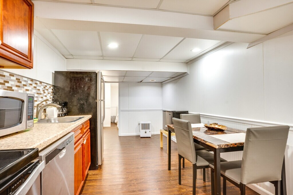 Embark on your New York City adventure from this charming Englewood, NJ apartment. This 2-bedroom, 1-bathroom basement-level unit offers a cozy retreat with a fully equipped kitchen and a desk workspace. Located within walking distance to shops and restaurants, you'll feel at home while exploring the vibrant city. The apartment features a smart TV, a dining table, and a desk workspace, making it ideal for both relaxation and productivity. The kitchen is fully equipped with a stove, oven, refrigerator, dishwasher, microwave, and drip coffee maker, along with all necessary dishware and cooking basics. Parking is available in a shared driveway for one vehicle, with additional street parking on a first-come, first-served basis. Situated in Englewood, NJ, this apartment provides easy access to local shops and restaurants. Enjoy the shared outdoor space with a fenced yard and patio dining area, perfect for unwinding after a day of exploration. Quiet hours are observed from 10:00 PM to 8:00 AM. The apartment features low ceilings, not recommended for guests 5'8" or taller. Access requires two steps, and the unit is equipped with four exterior security cameras for safety. No smoking, pets, or parties are allowed, and guests must be at least 25 years old to book. Additional fees and taxes may apply, and a photo ID may be required upon check-in. Includes a desk workspace and free WiFi, allowing for a remote work-friendly environment. [SI]