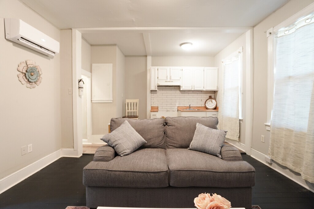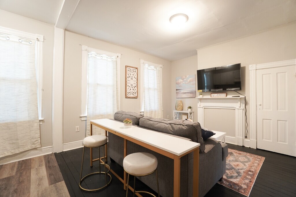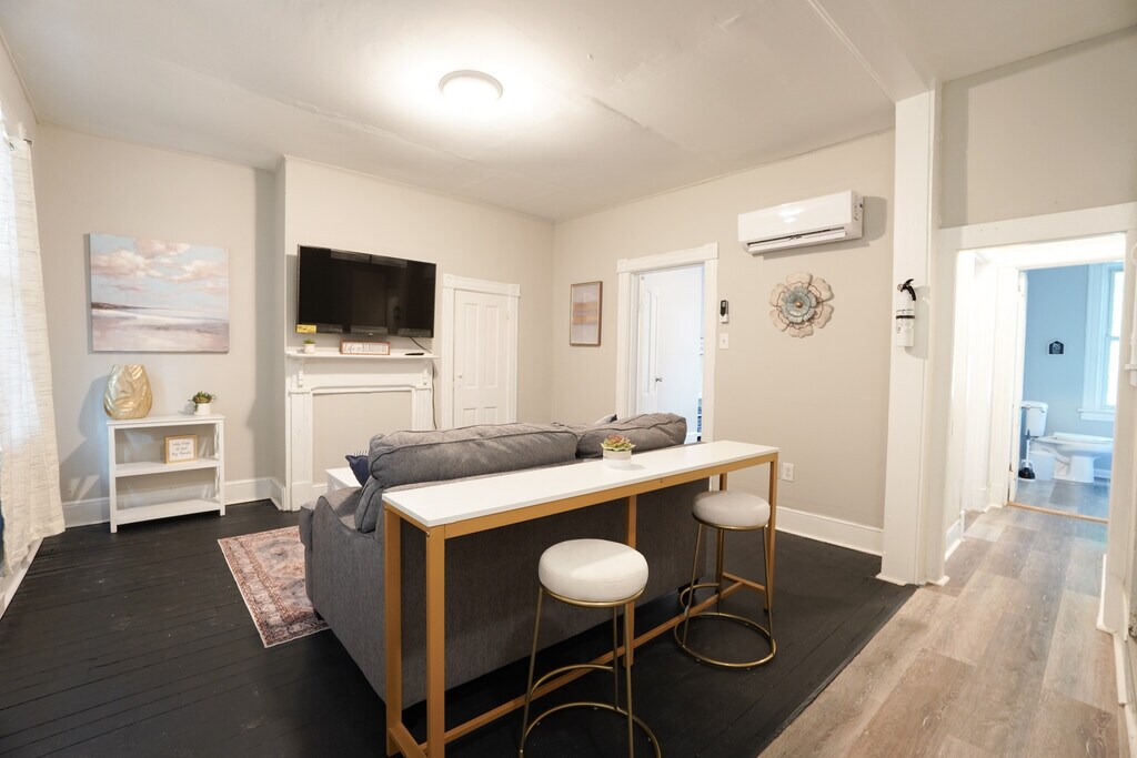 Apartamento C es un centro completamente amueblados de 1 habitaciones, que están en la 2nd piso de este renovado de tríplex. Cerca de Olde Towne Portsmouth. Cama tamaño queen (camas incluidas) y 2 armarios en la habitación. Sala de estar está abierta a la cocina con rincón de despensa, y armario completo para almacenaje. La cocina está completamente equipada con refrigerador, horno, estufa, horno de microondas, cafetera y cocina completamente equipada con platos y de compras. Sofá de tamaño completo, SmartTV con Internet/Wi-Fi gratuito y Bar parte superior para taburetes también están presentes en el área de estar. Baño completo con ducha y toallas incluidas para tu comodidad. Hay una lavadora y secadora en el área común del edificio para usar como disponibles. Te encantará este nuevo espacio con un pequeño patio trasero. Gran cantidad de parques cercanos y Olde Towne, tiendas y restaurantes a una caminata de distance.Utilities y de Internet están incluidos en el alquiler mensual.