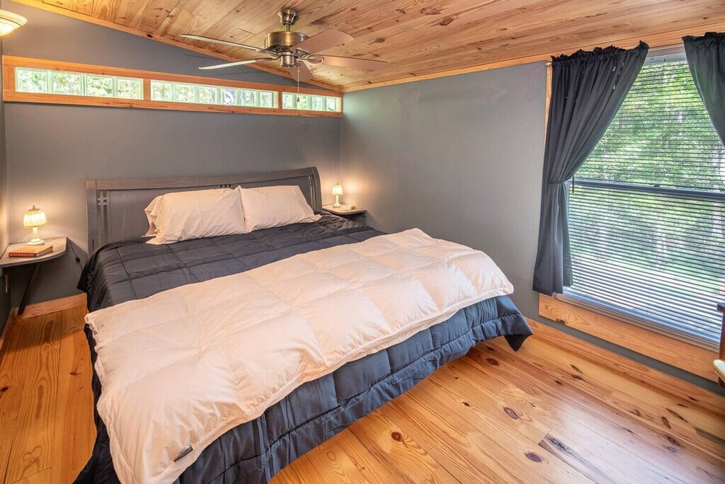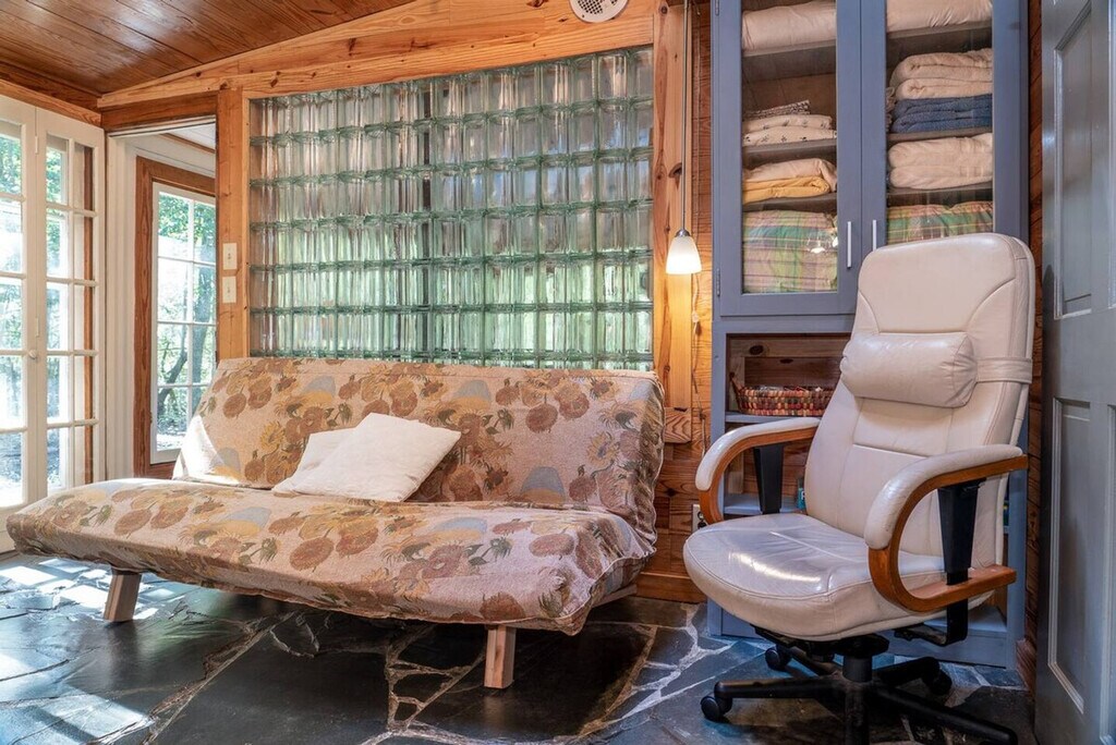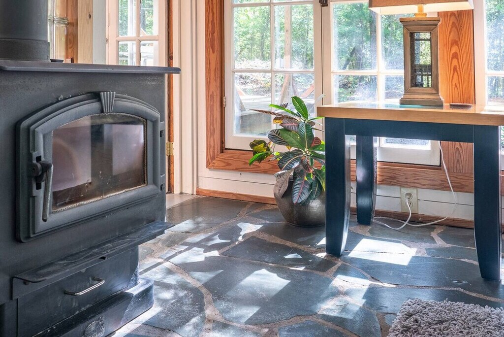 This hand-built artist haven is full of character and charm, located about 15 minutes from Chapel Hill, Pittsboro, and Saxapahaw. It offers an ideal getaway for those who want to spend time in nature while still being close to the city. The rustic atmosphere is complemented by modern amenities, allowing you to build a fire, soak in the tub, and admire the great outdoors from the picture windows. This 3-bedroom, 2-bathroom home sits on 5 acres, providing a spacious and peaceful getaway while still being 15 minutes from town. The home features a handmade feel with many artsy touches like original mosaics, wood and slate floors, and a wood stove for experienced fire tenders on cold days and evenings. The abundance of windows and great art make it feel warm and inviting, offering a unique and hard-to-find charm. There is parking available for 3-5 cars. Well-behaved pets are welcome with a $50 fee per pet per stay. Please inquire about the pet policy. The neighborhood offers attractions such as Franklin Street (9.6 mi), Kenan Stadium (10.4 mi), and The Barn at Valhalla (7.5 mi). Nearby restaurants include Saxapahaw General Store Cafe (11.7 mi) and The Mod in Pittsboro (12.8 mi). For groceries, Lowes Food's is 8.5 mi away, and Harris Teeter is 9.6 mi away. The property is also conveniently located near hospitals like UNC Hillsborough Campus (18.2 mi) and airports such as Raleigh-Durham International (28.7 mi). The home has a very outdoorsy feel, and you're likely to see squirrels, birds, and maybe even a fox or raccoon. Summertimes are usually full of bugs, and cobwebs can appear overnight. The home is chemical and fragrance-free for easier breathing and better sleep. Caution to older and physically challenged people: there are stairs and many levels in this house, making it unsuitable for those wanting a single-level place. A car is essential as Uber and Lyft do not usually come out here. [SI]