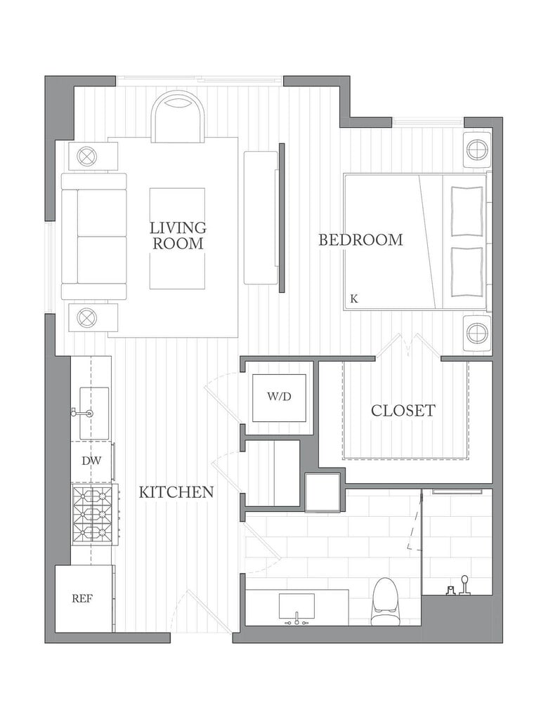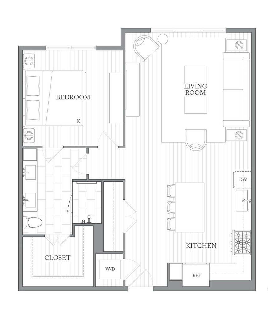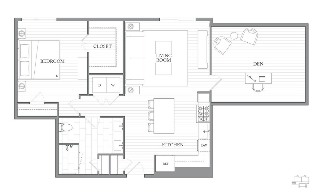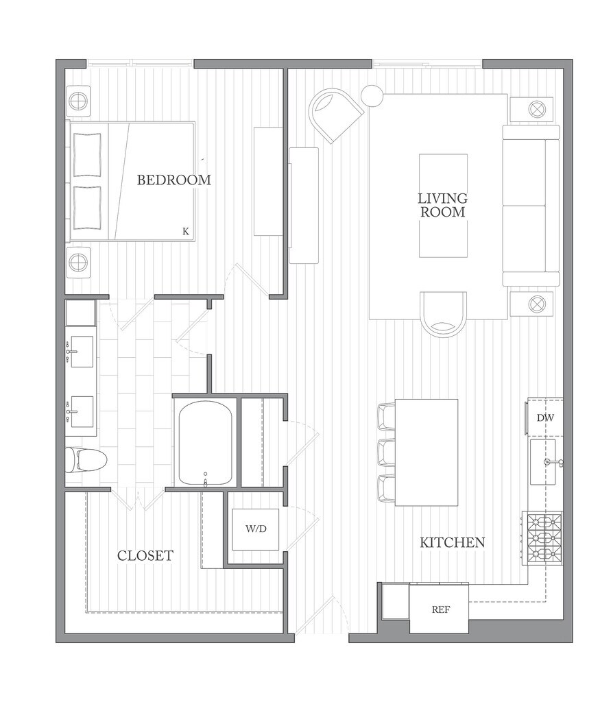 1 Dormitorio, 1 Baño, 653 pies²Disponible AhoraGalería del Modelo