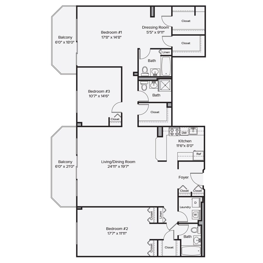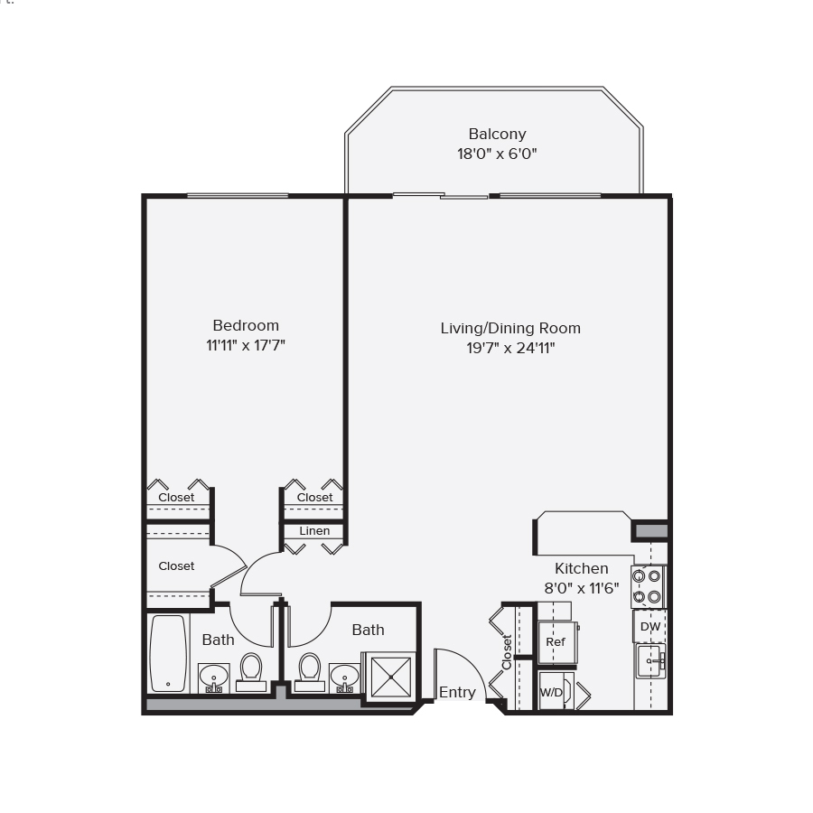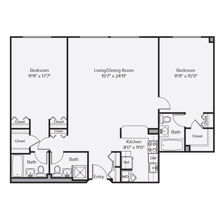 Modelo de apartamento: 1BLlame para Precios1 Dormitorio, 2 Baños, 956 sq ftNo Disponible![]()