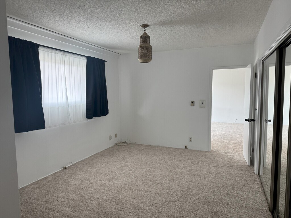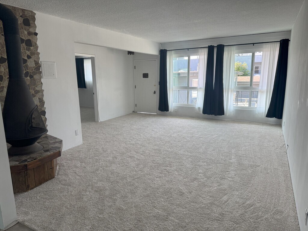 Perfect for a single or couple who desire extra space & 2 blocks from the beach! Spacious (1,200 sq. ft.), bright top floor (3rd floor) unit in 12-unit building. Lots of storage cabinets, shelves and closets! Formerly 2BR, one wall removed to enlarge living space, so 2nd bedroom is now an office/bonus room. New flooring (carpet and laminate), unfurnished, includes underground garage (one parking space). Controlled access building. Elevator, laundry onsite, refrigerator, stove, dishwasher, microwave. Owner pays HOA fees, which include water, gas and trash. Tenant pays electricity. No pets, no smoking. Available now, but rental start date is flexible.
