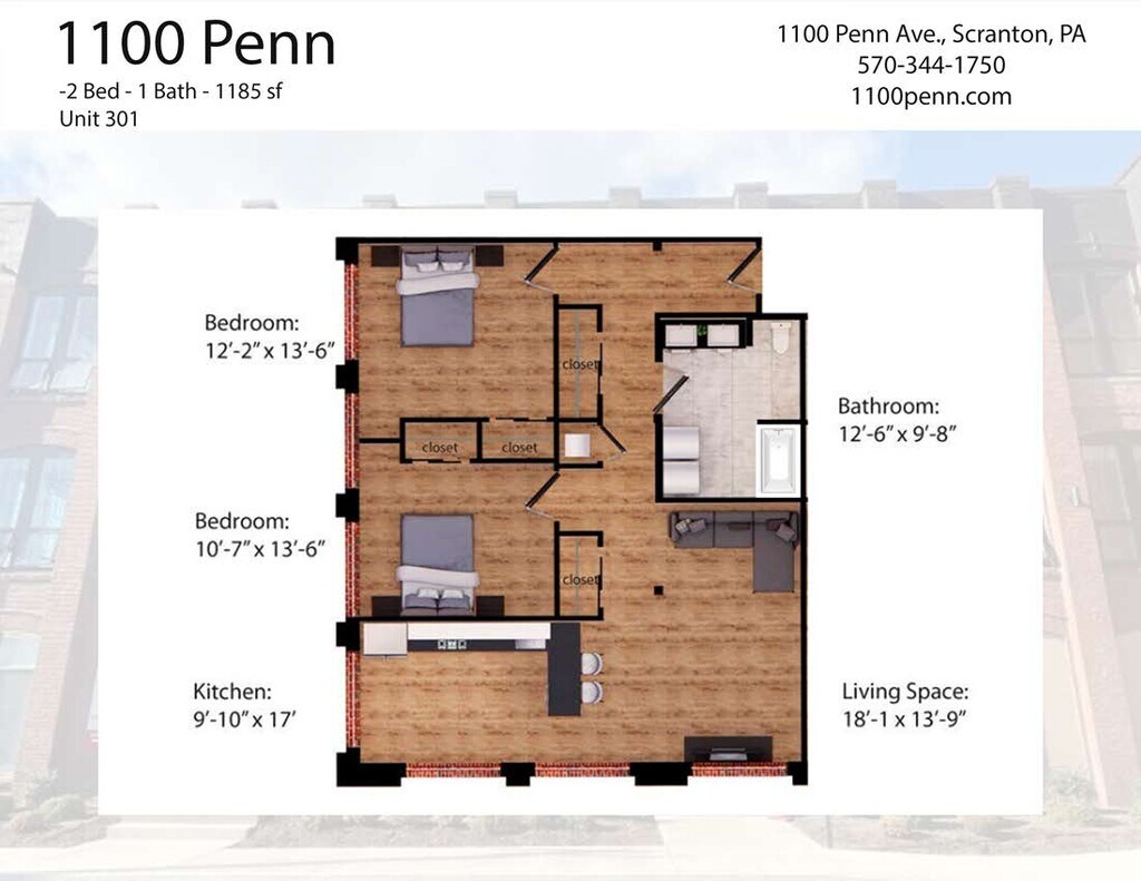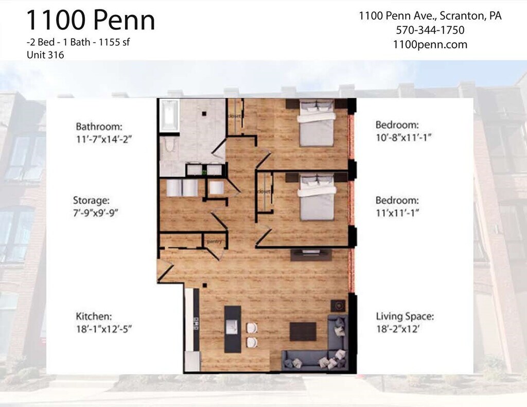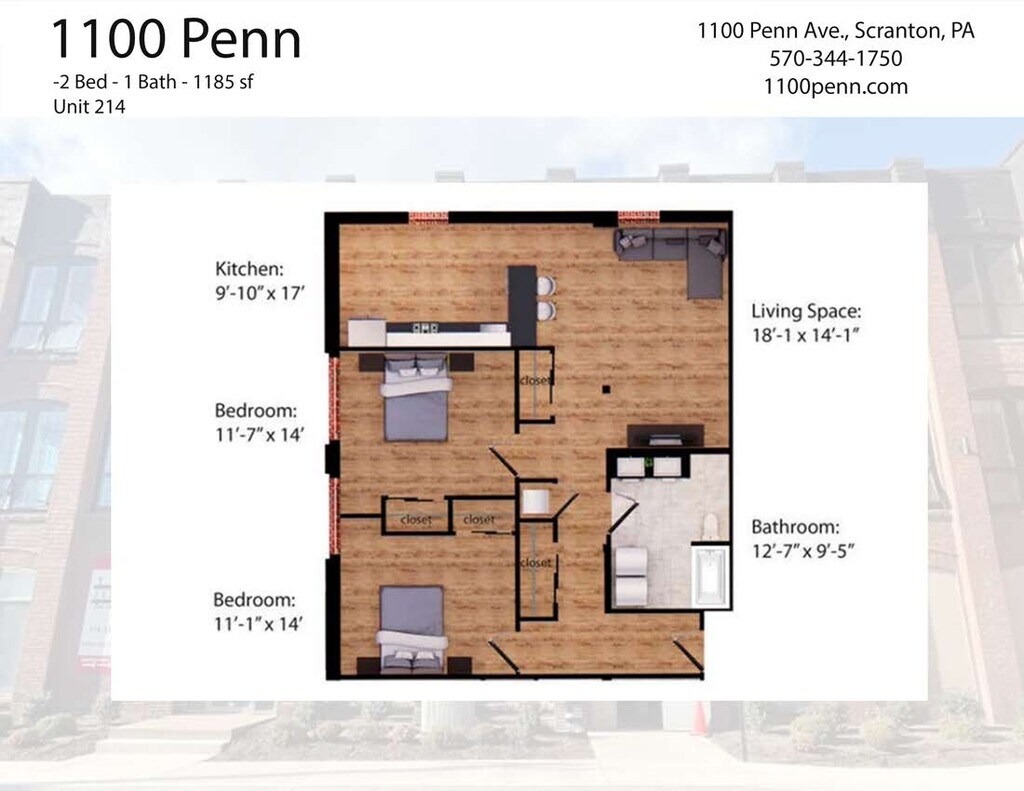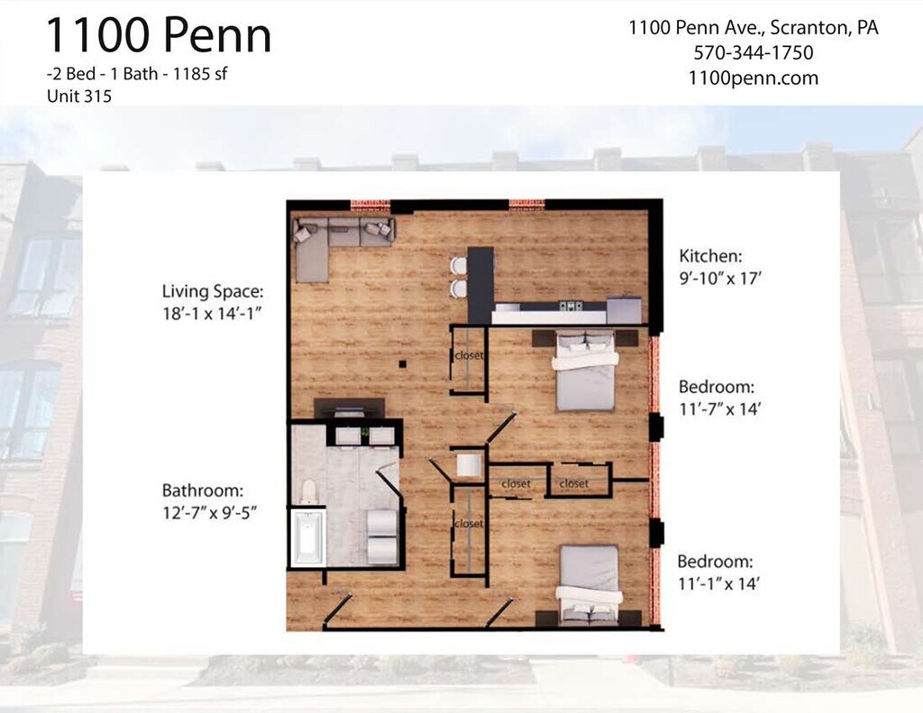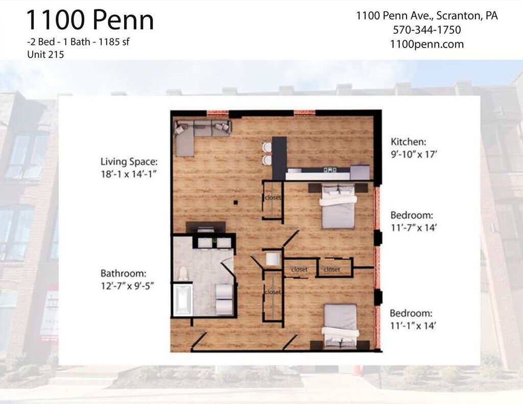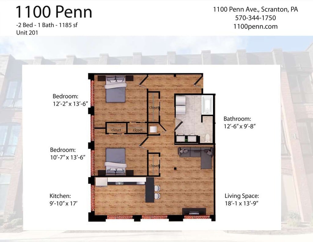 1100 Penn consists of 76 brand-new, luxury studio, one- and two-bedroom units inside a historical warehouse overlooking the Scranton Preparatory School fields. The restored columns and exposed brick walls highlight the original, industrial characteristics of the building. The high ceilings and large amounts of natural light further add to the features of these spacious apartments! These luxurious apartments are conveniently located half of a block from Wyoming Avenue and just minutes from Scranton Preparatory School, Geisinger Medical School, Marywood University, and downtown Scranton. On-site parking for tenants, a video/audio intercom system, and 24-hour camera surveillance are just some of the included amenities. 1100 Penn offers in-unit washers/dryers, brand-new stainless steel appliances (refrigerator, range/oven, microwave, dishwasher), and even common area balconies overlooking downtown Scranton, the surrounding mountains, and a pristine high school athletic complex. A gym and outdoor patio area are also available to tenants. Water, sewer, gas, garbage/recycling, and internet are all included.