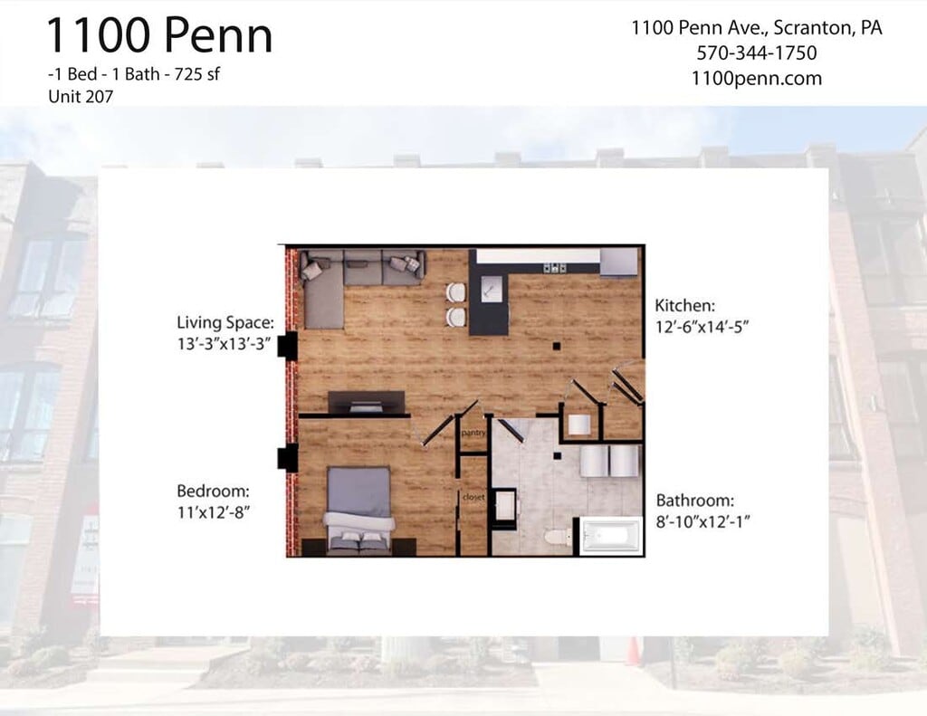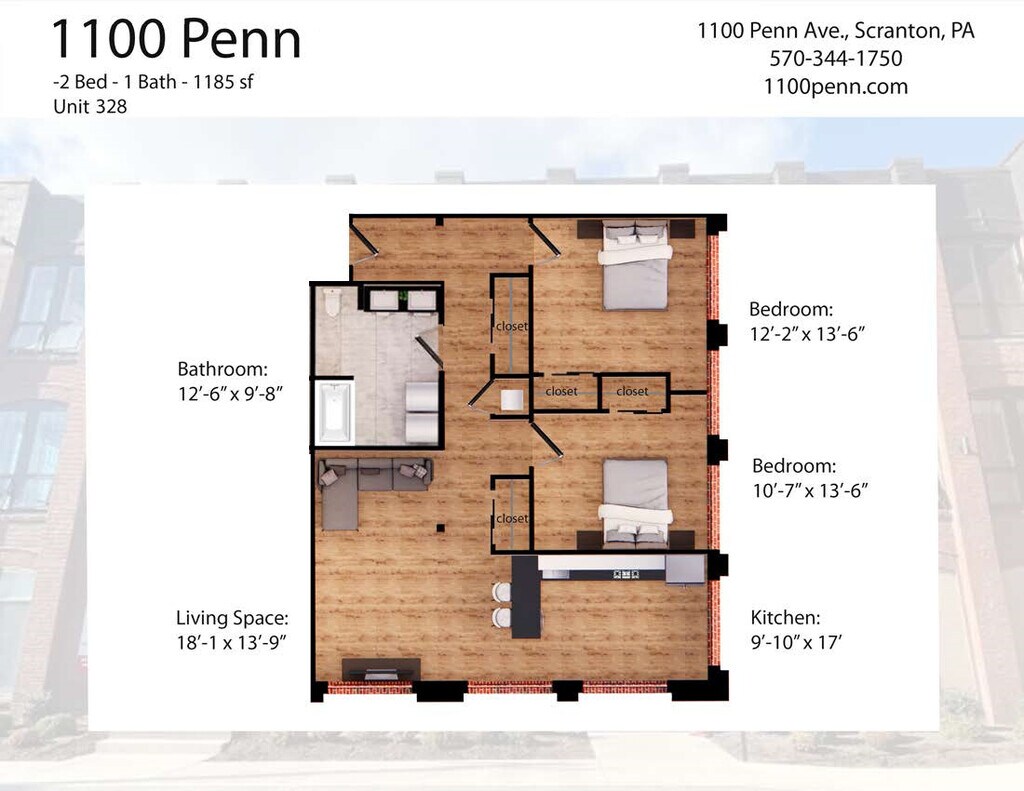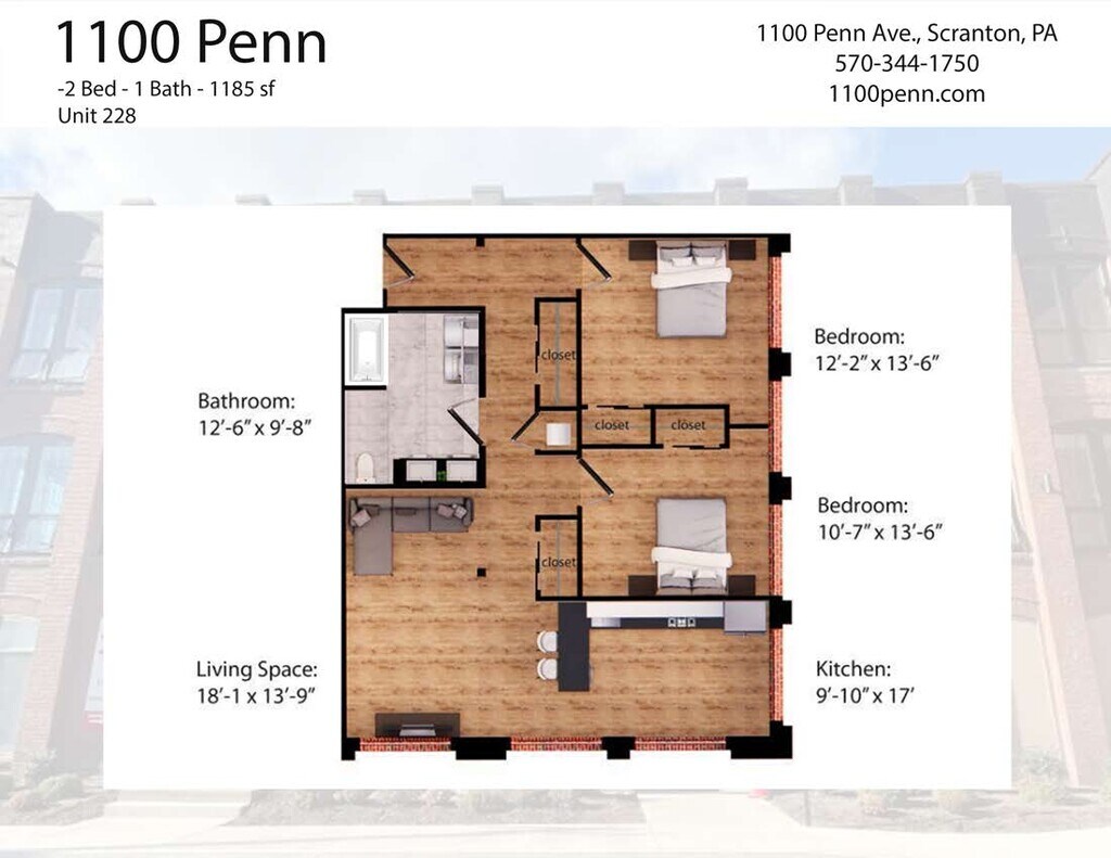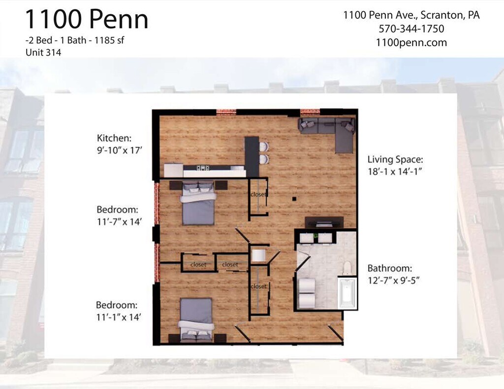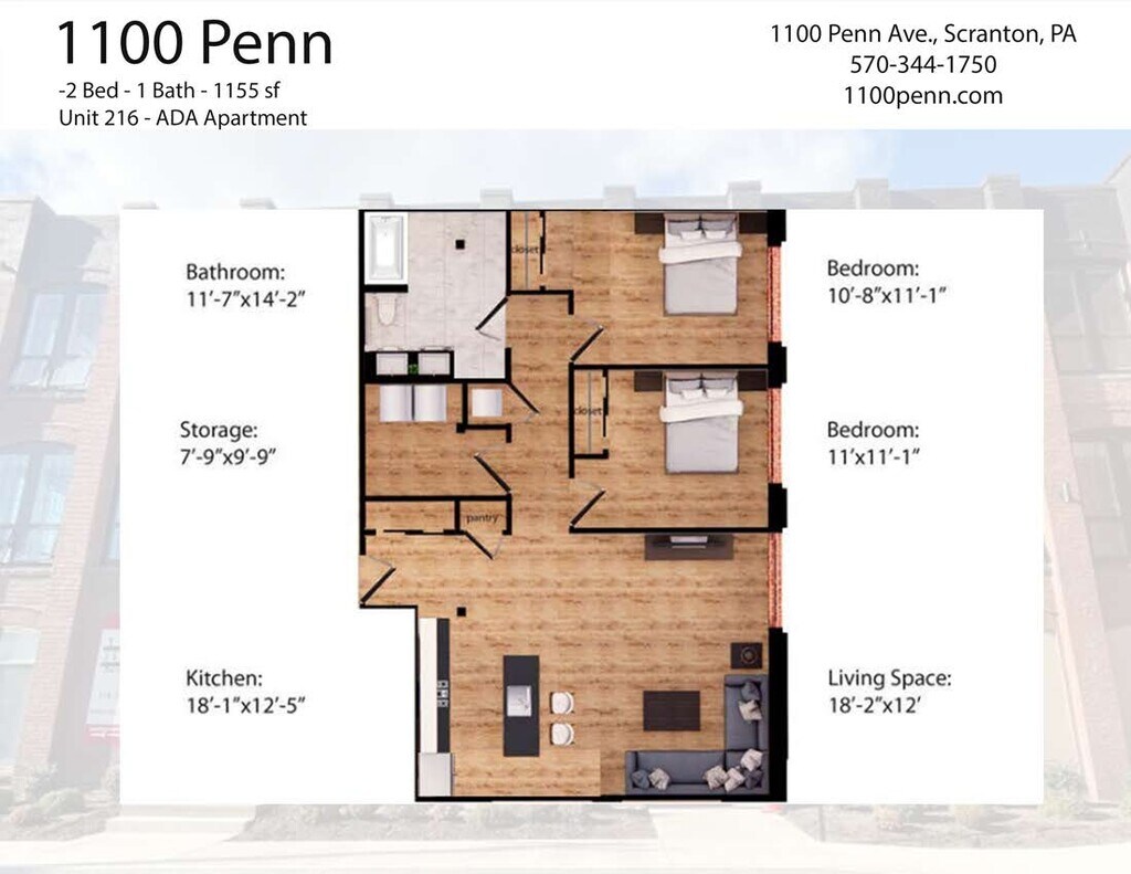 1100 Penn consists of 76 brand-new, luxury studio, one- and two-bedroom units inside a historical warehouse overlooking the Scranton Preparatory School fields. The restored columns and exposed brick walls highlight the original, industrial characteristics of the building. The high ceilings and large amounts of natural light further add to the features of these spacious apartments! These luxurious apartments are conveniently located half of a block from Wyoming Avenue and just minutes from Scranton Preparatory School, Geisinger Medical School, Marywood University, and downtown Scranton. On-site parking for tenants, a video/audio intercom system, and 24-hour camera surveillance are just some of the included amenities. 1100 Penn offers in-unit washers/dryers, brand-new stainless steel appliances (refrigerator, range/oven, microwave, dishwasher), and even common area balconies overlooking downtown Scranton, the surrounding mountains, and a pristine high school athletic complex. A gym and outdoor patio area are also available to tenants. Water, sewer, gas, garbage/recycling, and internet are all included.