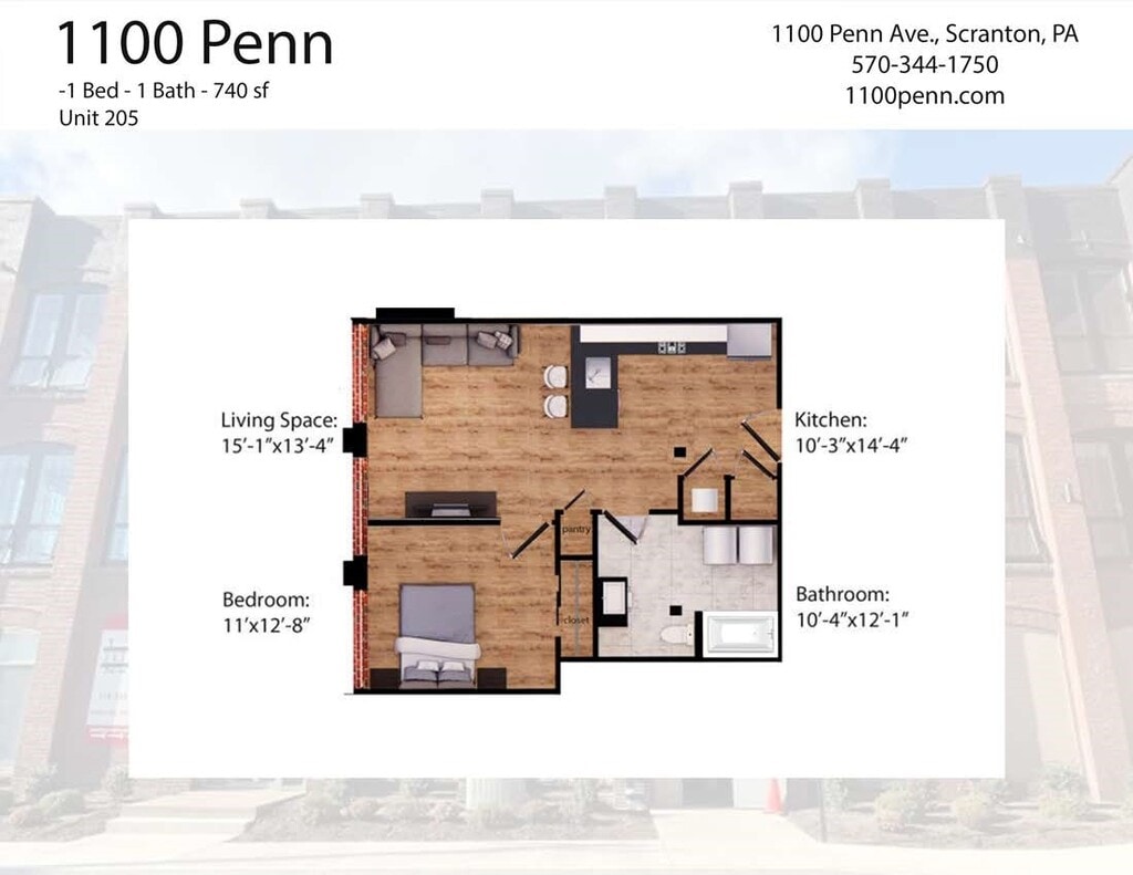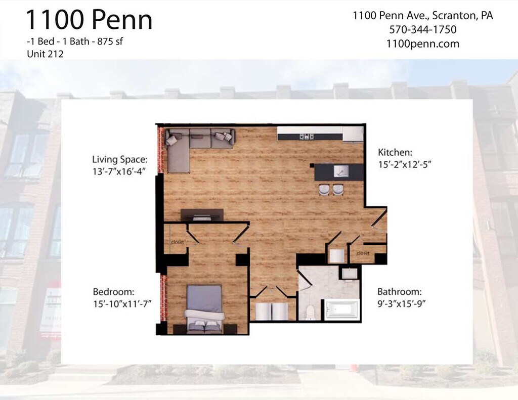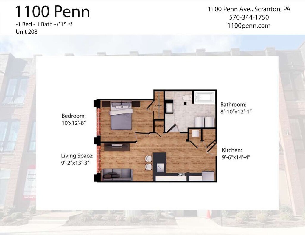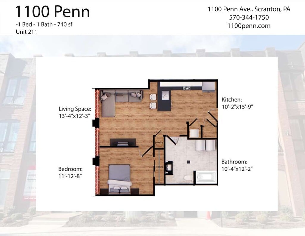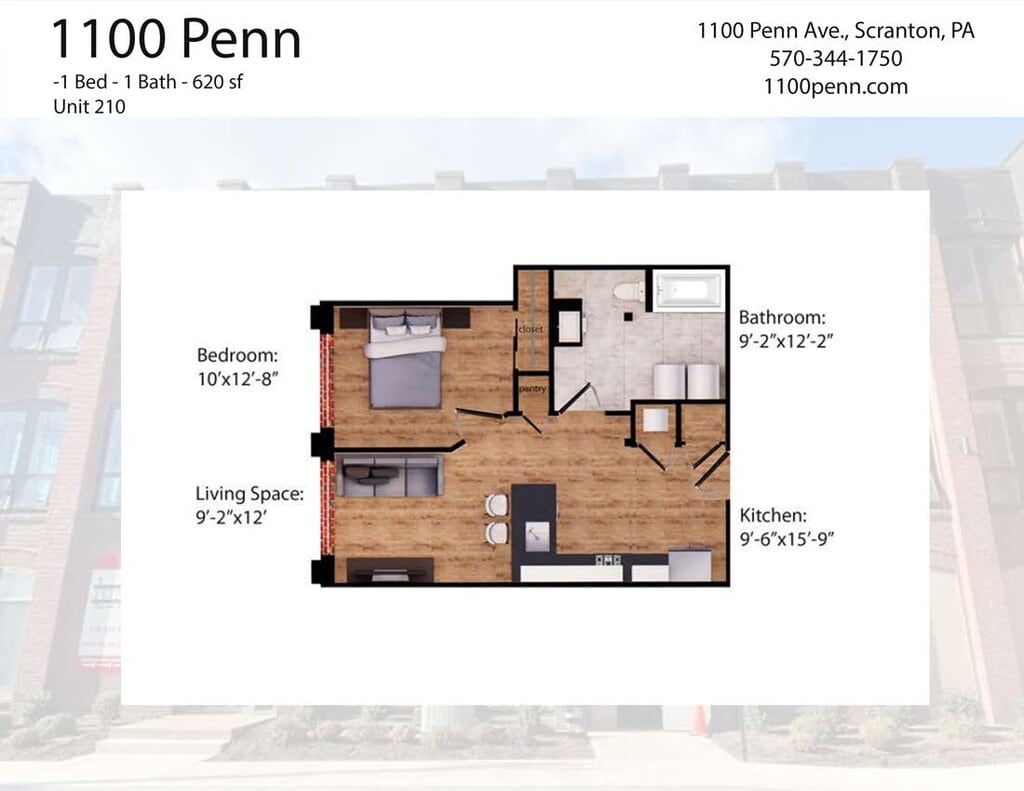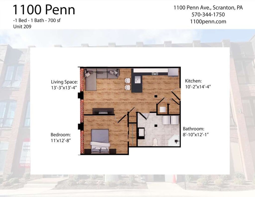 1100 Penn consists of 76 brand-new, luxury studio, one- and two-bedroom units inside a historical warehouse overlooking the Scranton Preparatory School fields. The restored columns and exposed brick walls highlight the original, industrial characteristics of the building. The high ceilings and large amounts of natural light further add to the features of these spacious apartments! These luxurious apartments are conveniently located half of a block from Wyoming Avenue and just minutes from Scranton Preparatory School, Geisinger Medical School, Marywood University, and downtown Scranton. On-site parking for tenants, a video/audio intercom system, and 24-hour camera surveillance are just some of the included amenities. 1100 Penn offers in-unit washers/dryers, brand-new stainless steel appliances (refrigerator, range/oven, microwave, dishwasher), and even common area balconies overlooking downtown Scranton, the surrounding mountains, and a pristine high school athletic complex. A gym and outdoor patio area are also available to tenants. Water, sewer, gas, garbage/recycling, and internet are all included.