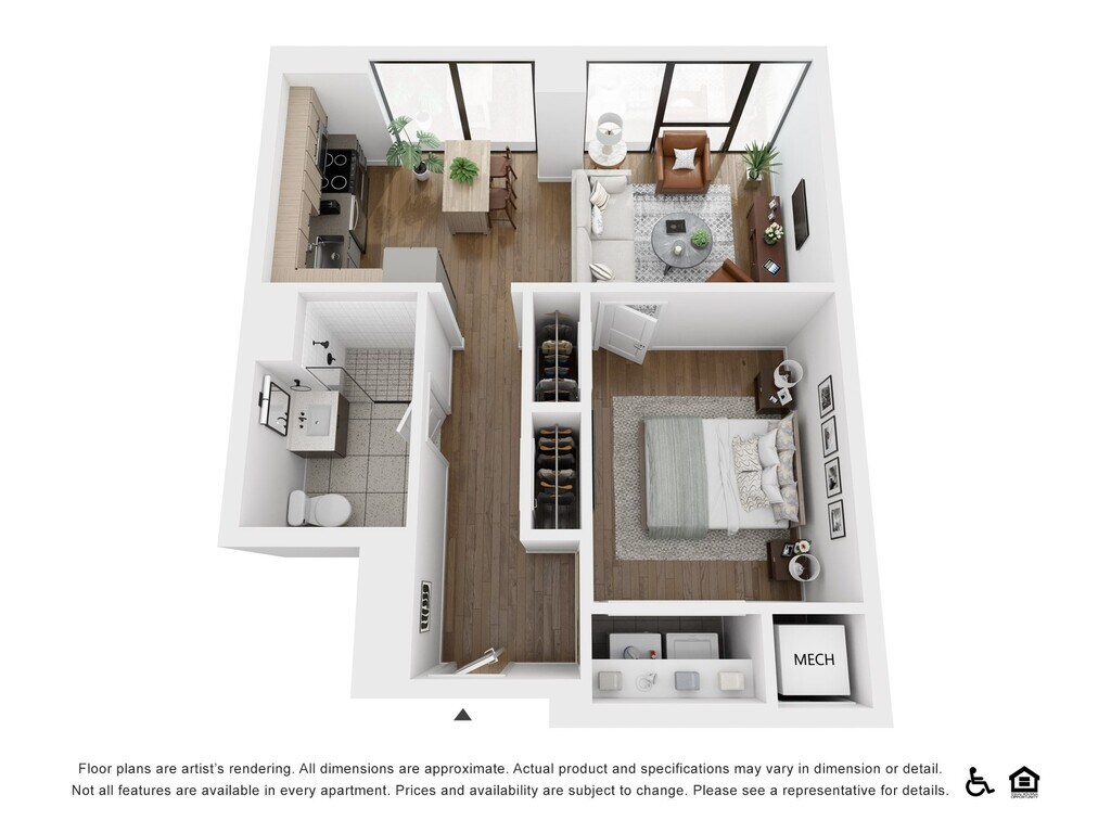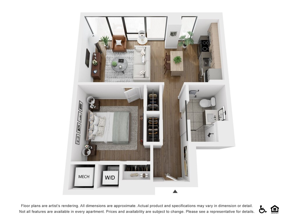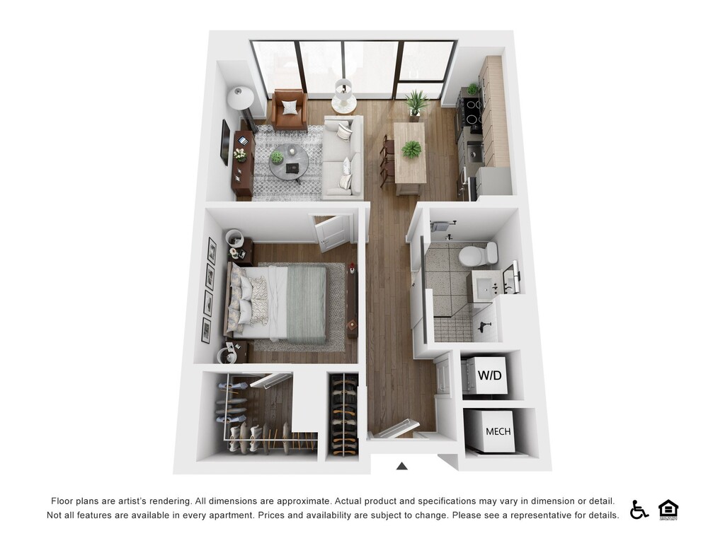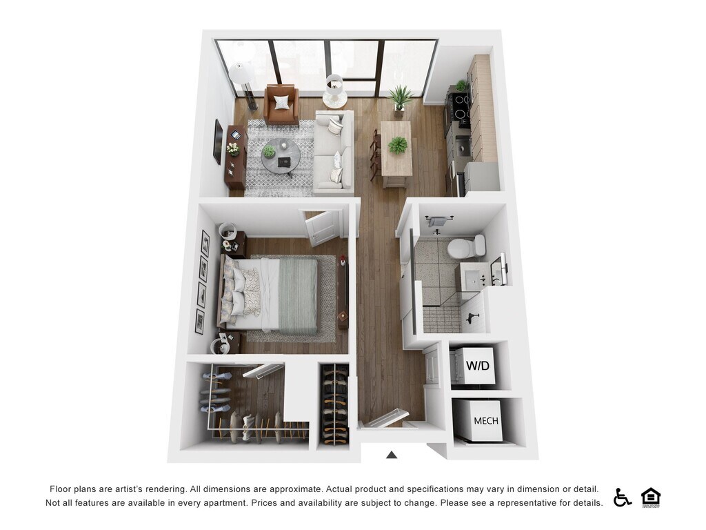 One Bedroom 1A - Plano 1 Los planos de la planta son una interpretación artística. Todas las dimensiones son aproximadas. Los tamaños o el detalle del producto real y sus especificaciones pueden variar. No todas las características están disponibles en todos los hogares para rentar. Los precios y la disponibilidad están sujetos a cambios. El alquiler que se muestra es mensual. Se pueden aplicar ciertos cargos, por ejemplo, entrega de paquetes, recolección de basura, agua, servicios, etc. Depositos varian. Consulta a un representante para conocer detalles.